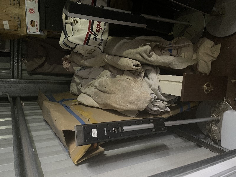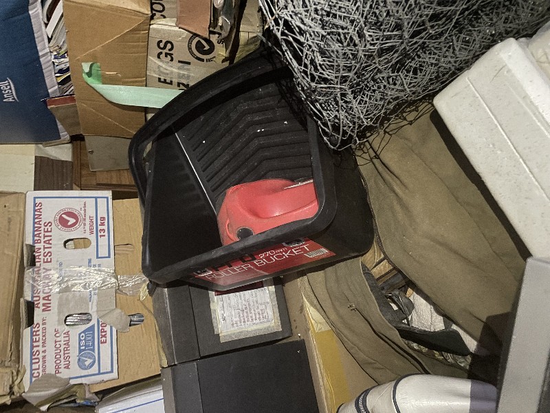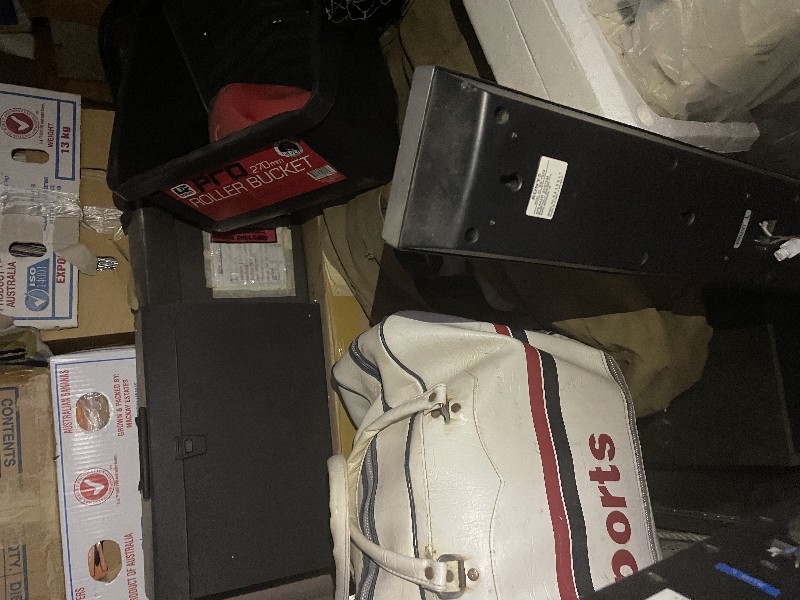 Speakers, new air conditioner split system , Tv art work, tool boxes, printer, ddvd player, draws x3 camera in bag, esky, mirror, kitchen items, roll of fence wire, i roll black plastic, glassware, painting items, spray gun acc,drop sheets, roller trays