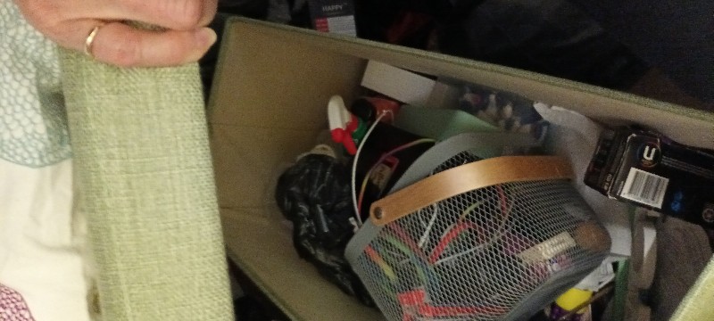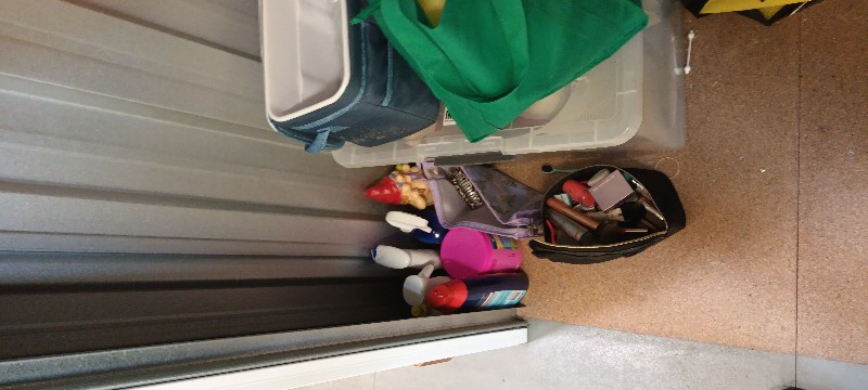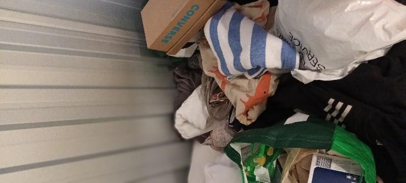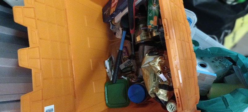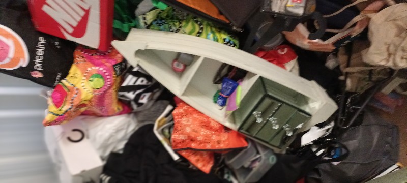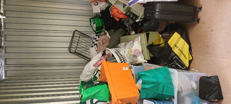 This space is filled with general household items and some personal belongings. There are ornaments, kitchen items, pantry items, bed and bathroom linen, A JBL Xtreme speaker, shoes, maybe some clothing, personal items, cleaning products. Mainly in bags and a few crates. There is no large furniture.