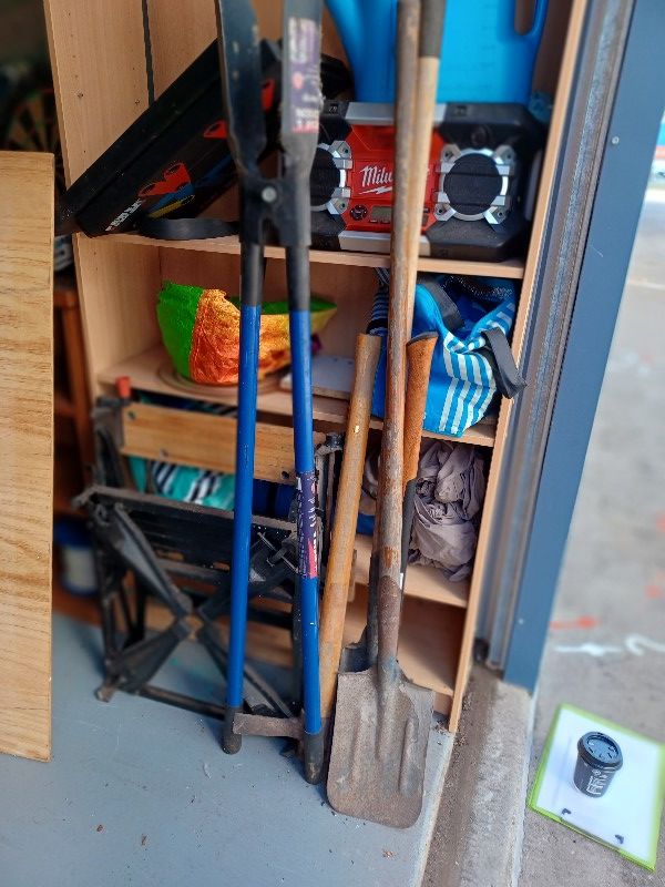 Gardening tools - shovels, rakes, hole pincher,