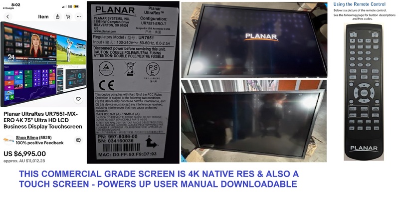 1. 1x 75 Inch PLANAR Ultra-Res UR7551 4K NATIVE LCD SCREEN (Working) THIS SCREEN IS HEAVY & 2 MEN LIFT!