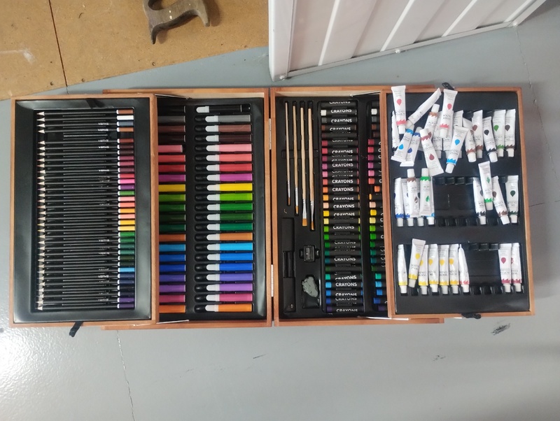 - Art set (pencils, crayons, markers, paints) in wooden briefcase - used, incomplete
