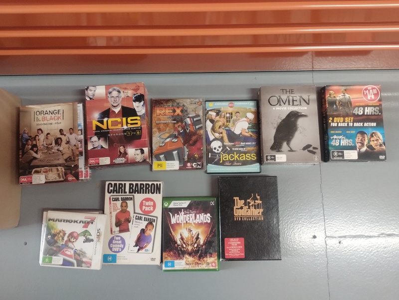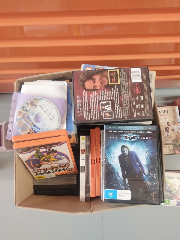 - Box of DVDs and video games