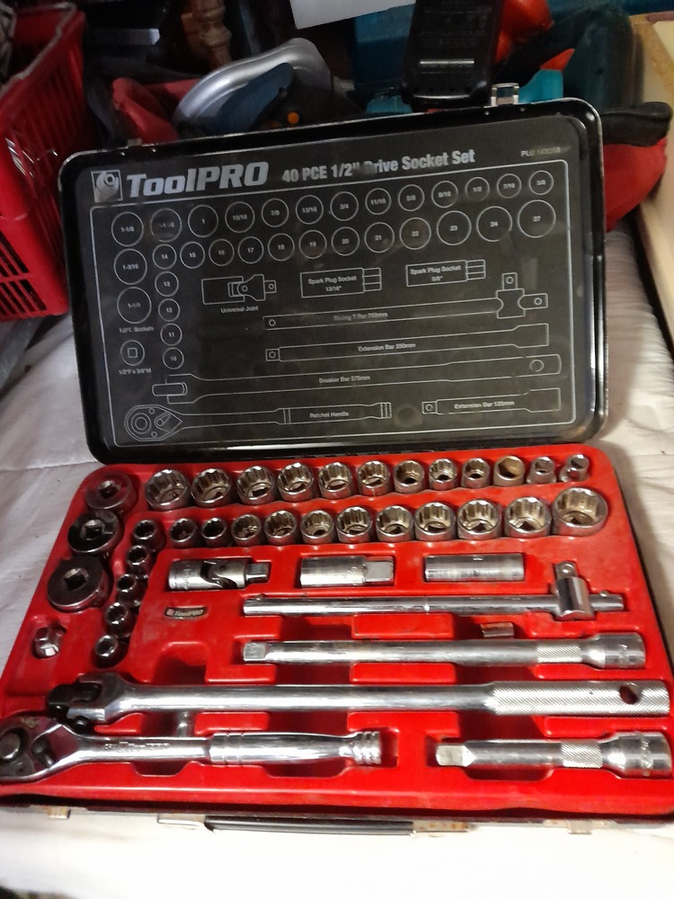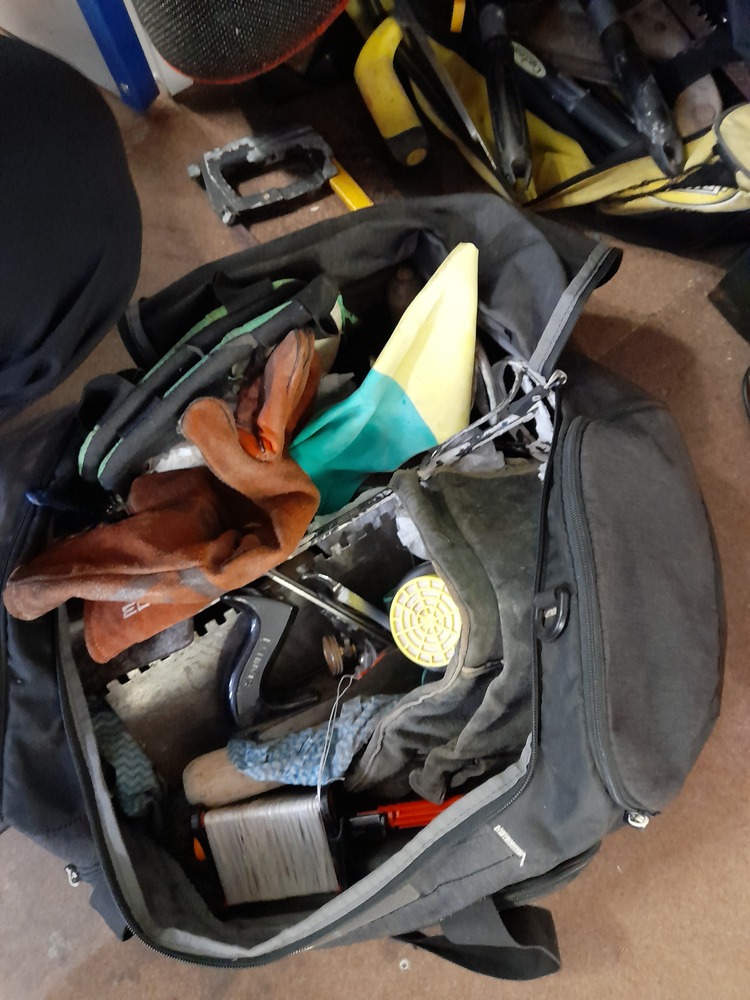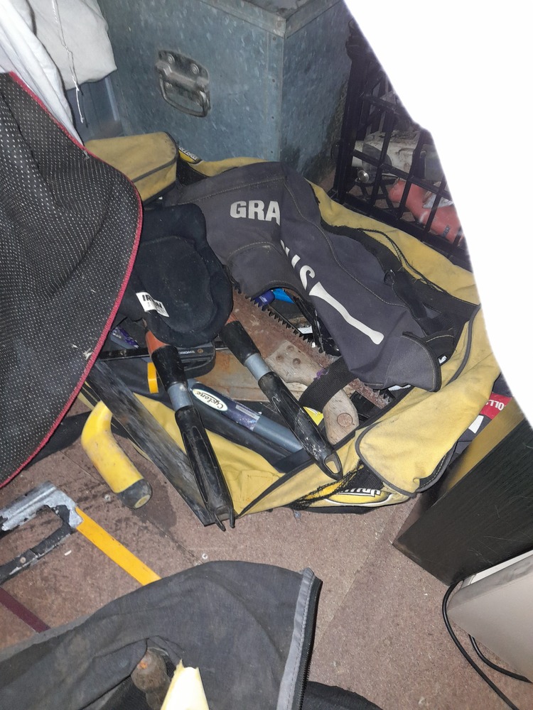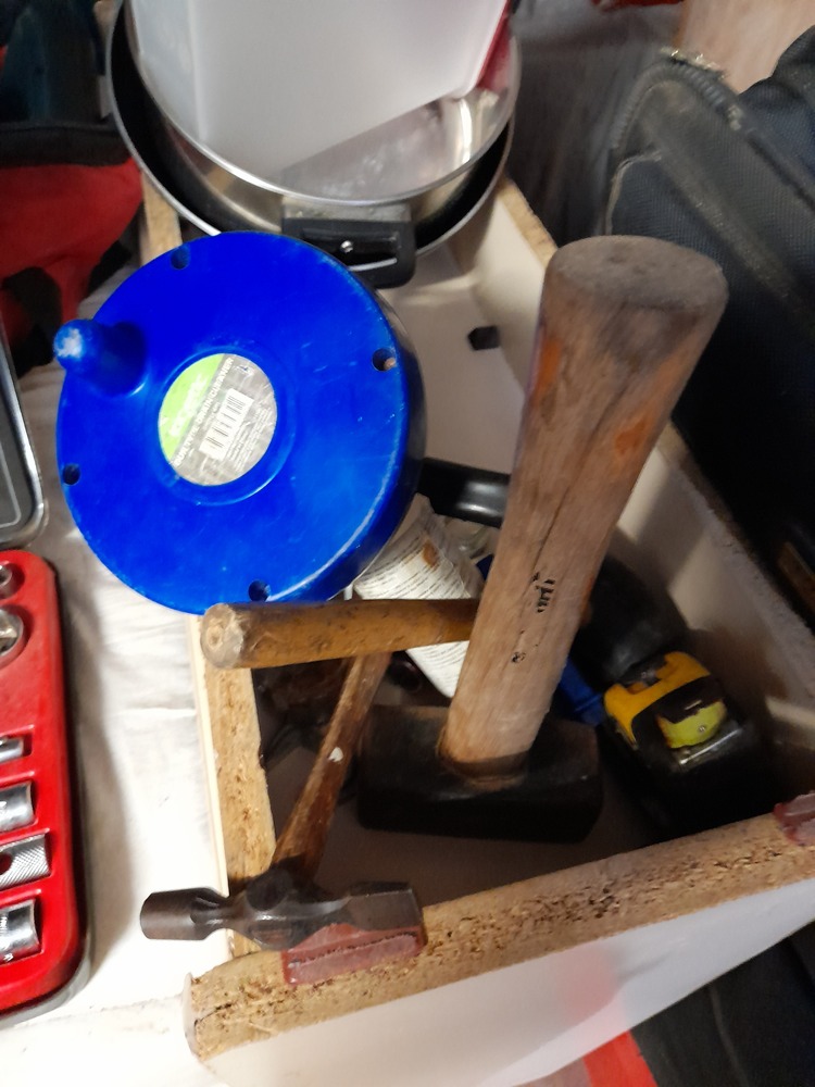 tools - sanders, circular saw, cordless drill, impact driver, hammers, saw, measuring tapes, socket set and more. Around 5/6 toolboxes. Ropes, paint brushes, tarps, hard hat and a jerry can.
