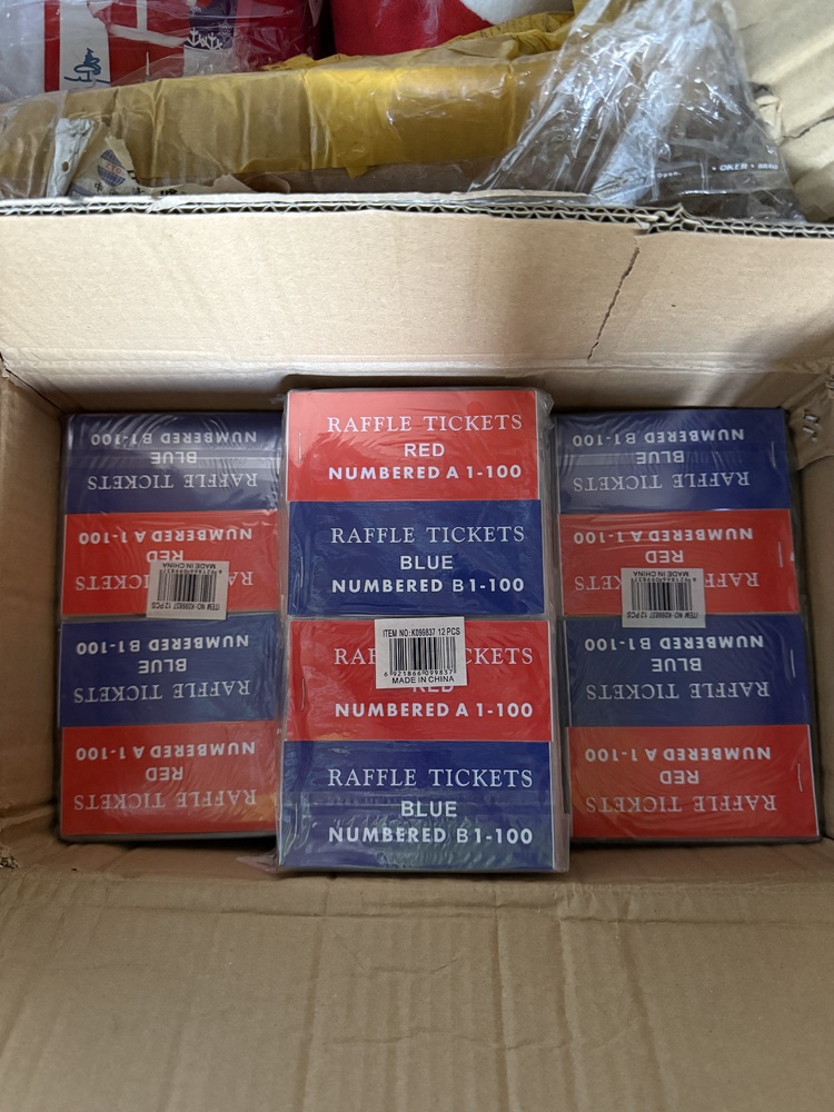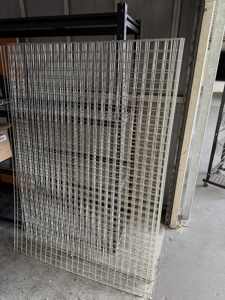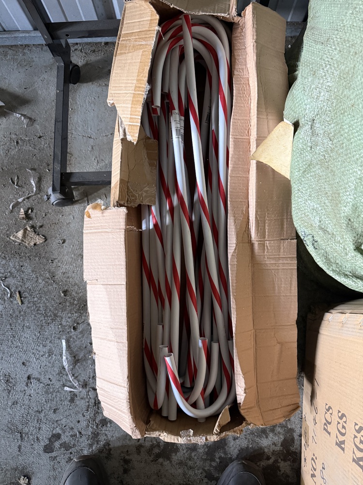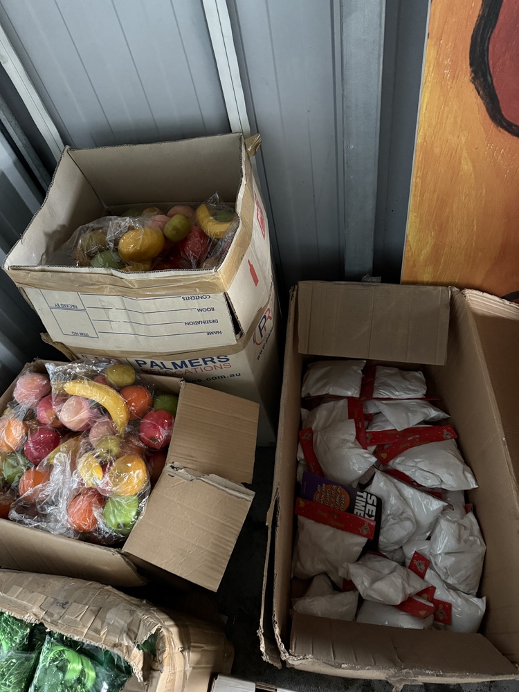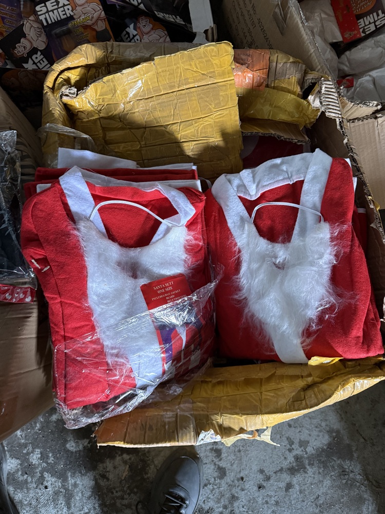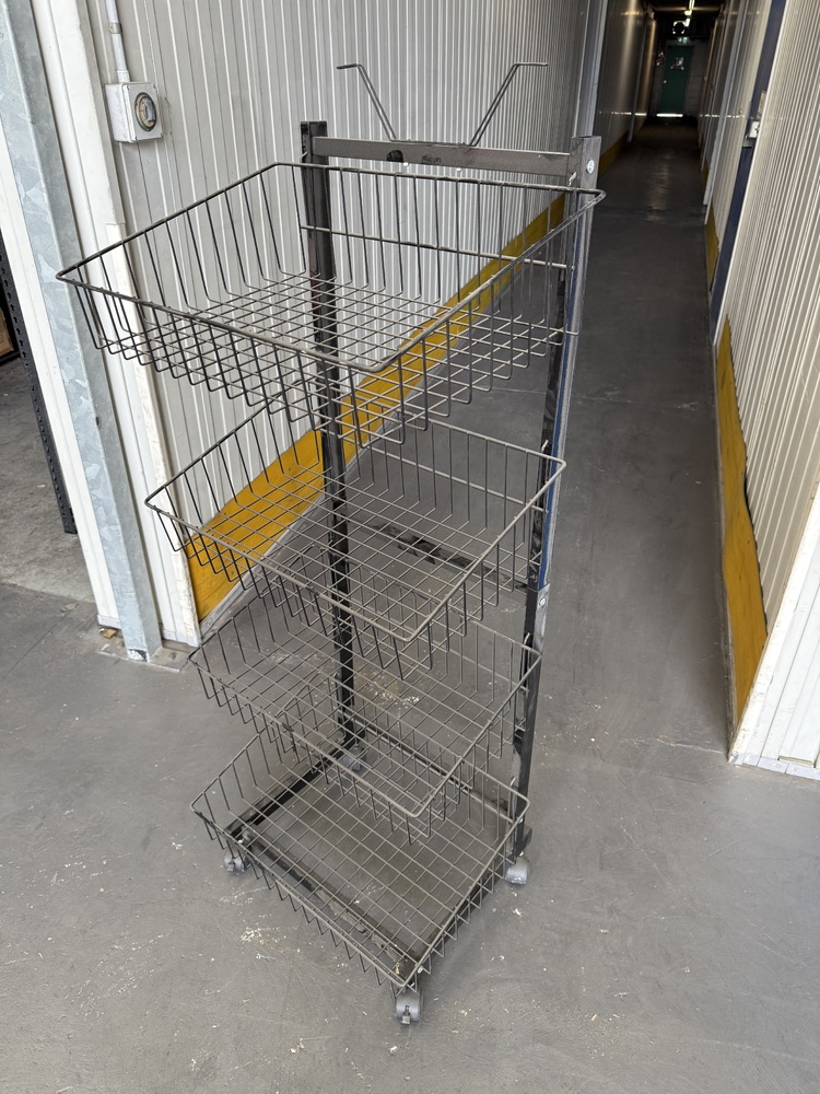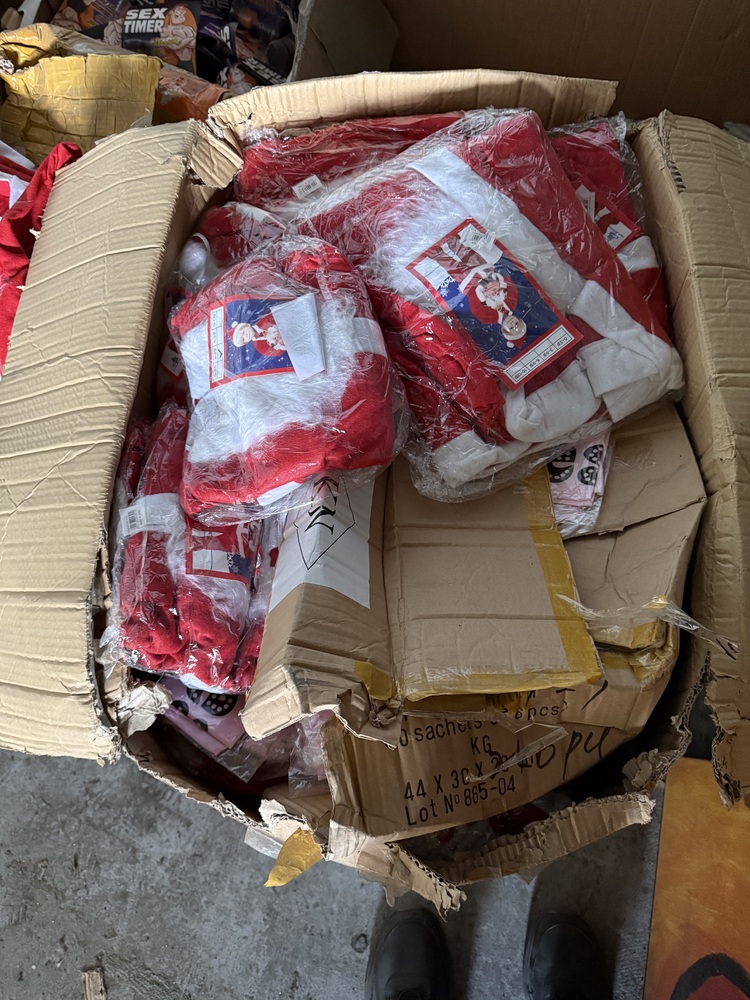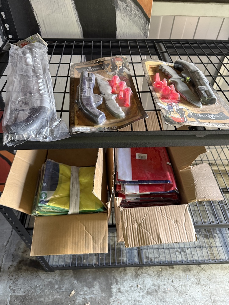 2x new metal shelf units 1800x54Dx1800H, metal stand with 4 basket shape shelves, large amount of lighting, 4x mesh display 1160x1660, large painting, box of union jack & Brazilian flags, new receipt books & raffle tickets, 2 x boxes of kids santa uniforms, boxes of fake fruit, boxes of masks & large sugar candy canes, all goods from gift shop.