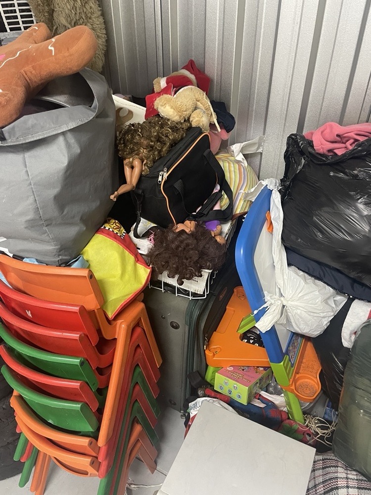 From what we can see in this unit, 3x1.5 meter, we can confirm there is some Alloy wheels/tyres, small speaker system, toys, chairs and quite a few unopened bags and suitcases. There are also some plastic containers full of items.