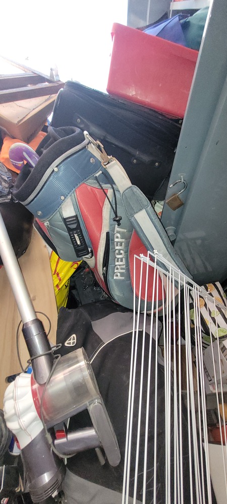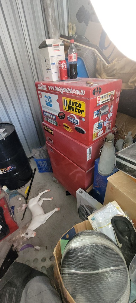 Metal drum x 2, Sawing horse x 2, Trestle table, Bar stool, Clothes rack, Metal cabinet, Golf bags x 3, Assorted golf clubs, Tool chest/box x 4, Scaffold, Whipper snipper x 2, Assorted household items, Dining table, Assorted shoes, Assorted kitchenware, Assorted DVD’s, Suitcase x 2, Trolley, Washing basket, Body board x 2, Stick vacuum, Assorted clothing, Chequer plate tiles, Scooter, Microwave, Various tools & car fender.