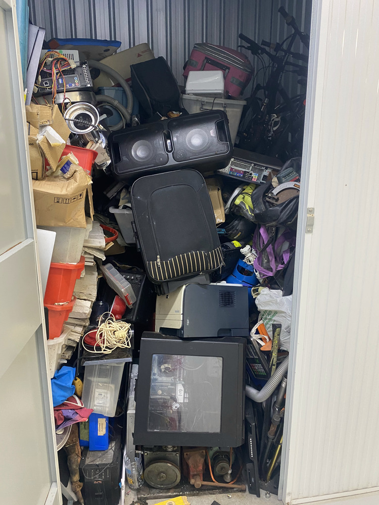 Unit sold as seen - Pushbike, 2 x Scooters, Dyson Vacuum, Assorted household items, Boxes with rubber self adhesive trim, Speaker, Computers, Printer, 2 x Suitcases, Gas Bottle, Assorted Tools, Monitor, Fishing Rods, Boogie Board, Bike Helmet