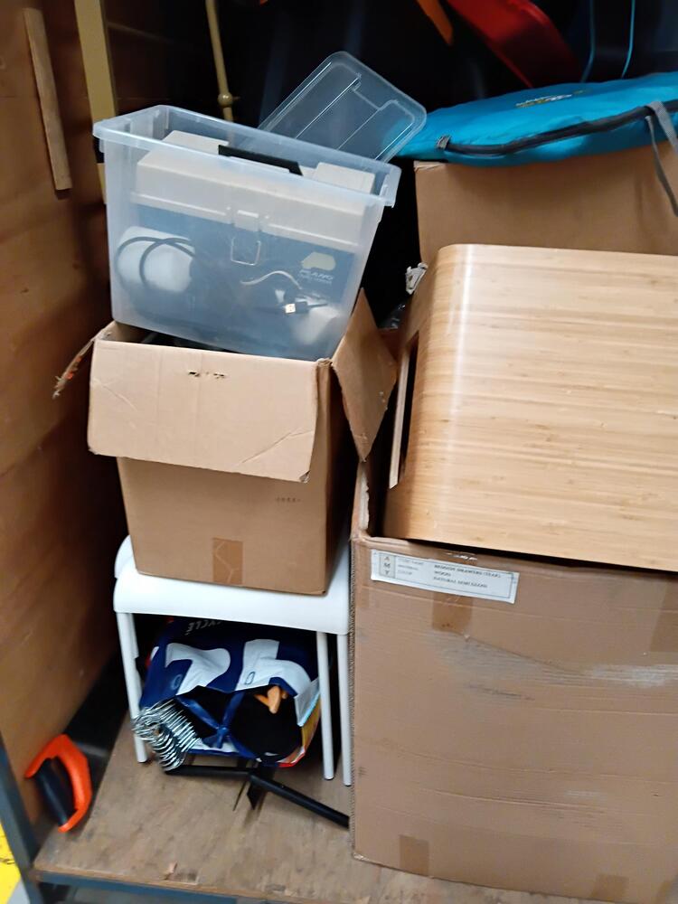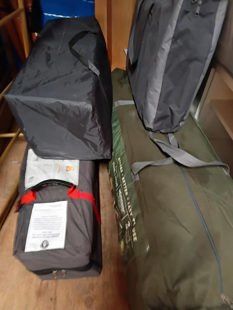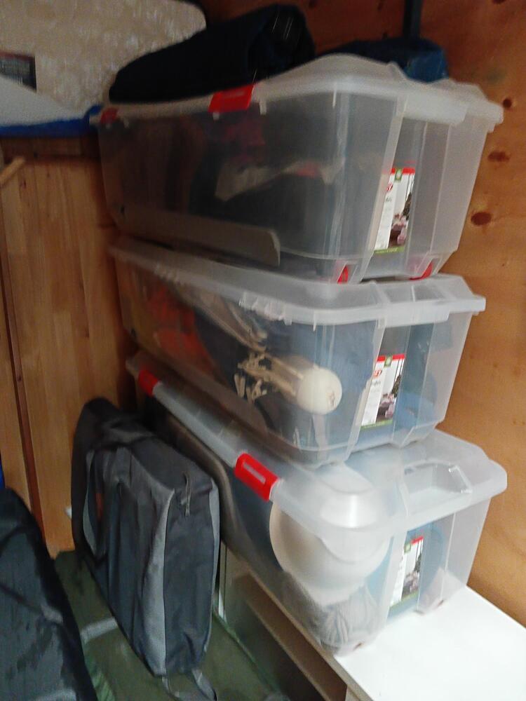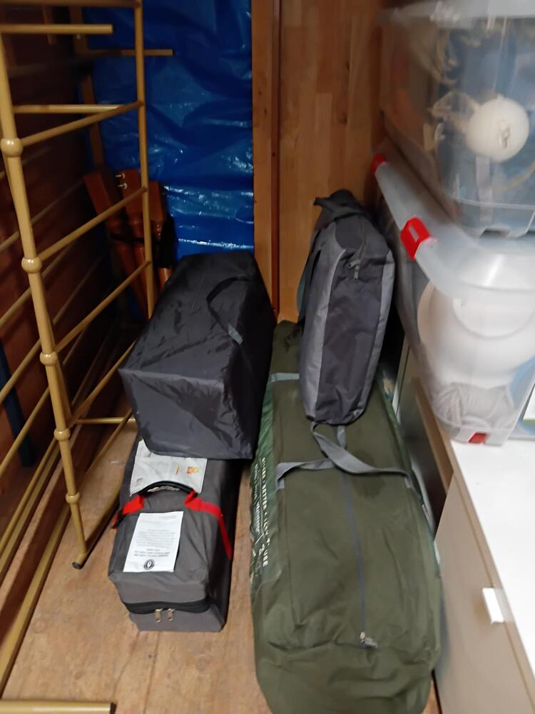 Camping equipment, surfboard, boxes, storage tubs, household equipment