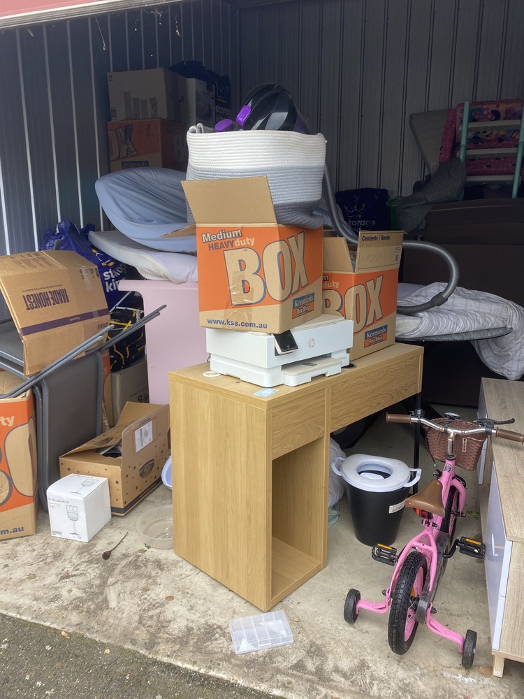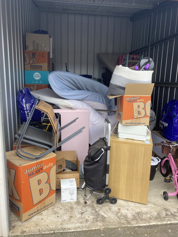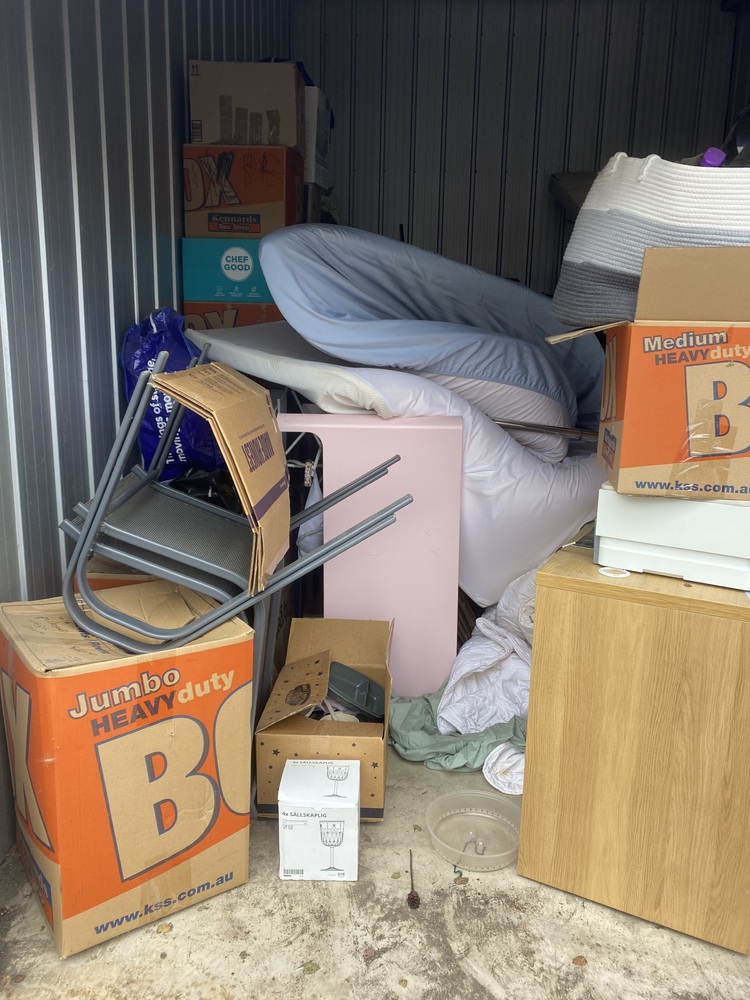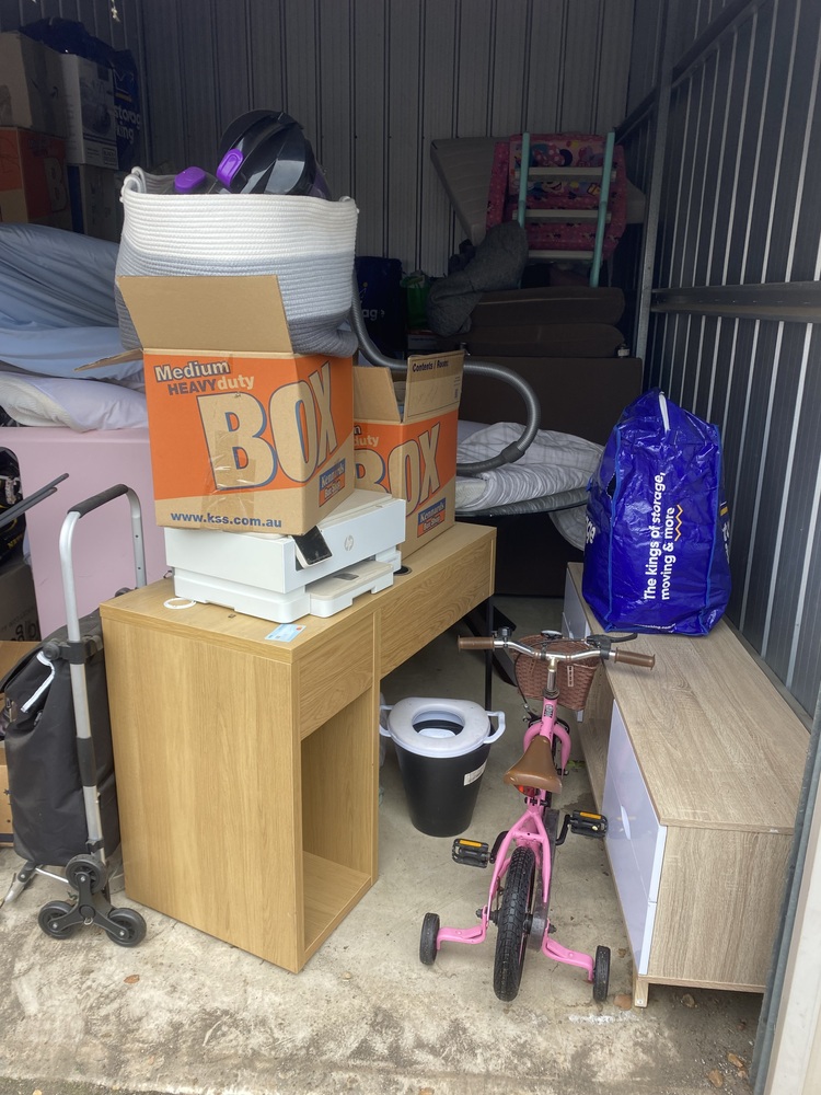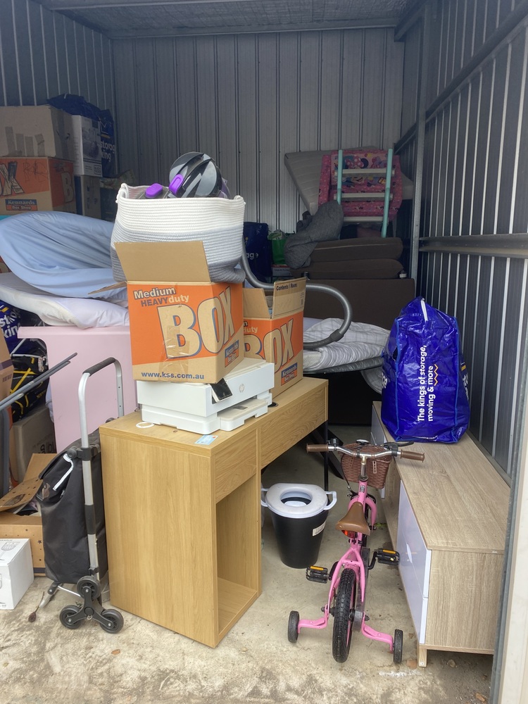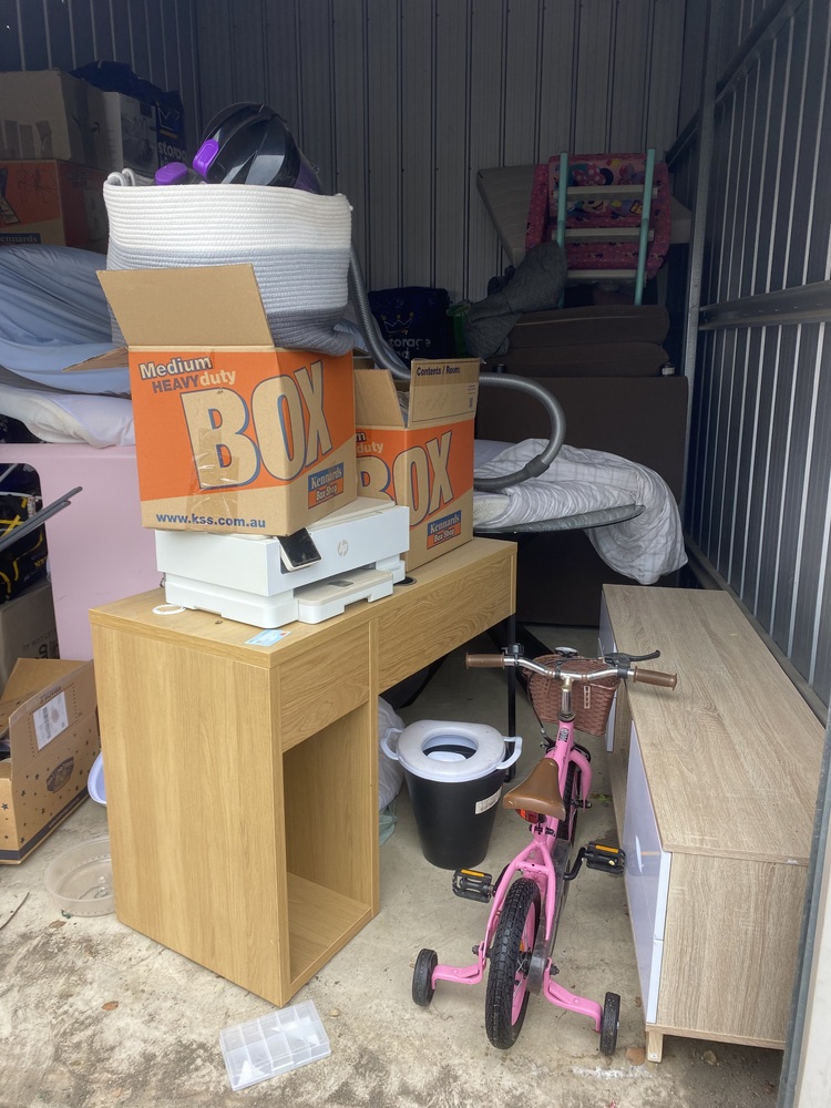 Unit with couch, cot, homewares, children's bike, kids items. Have not opened boxes deeper than the entrance,