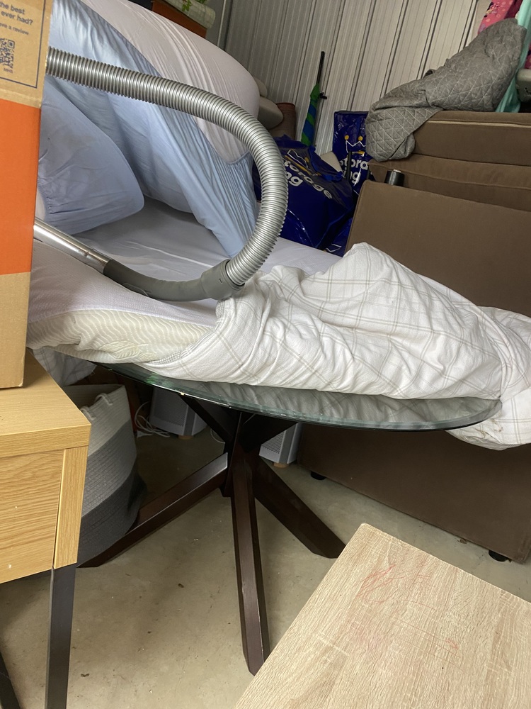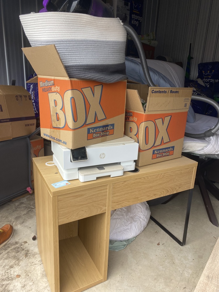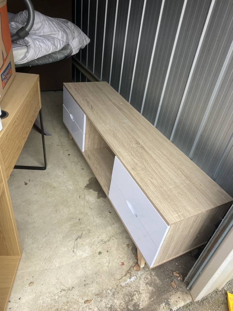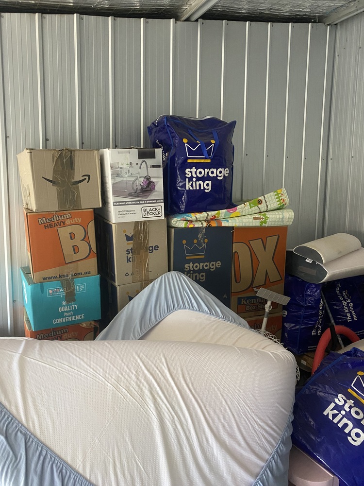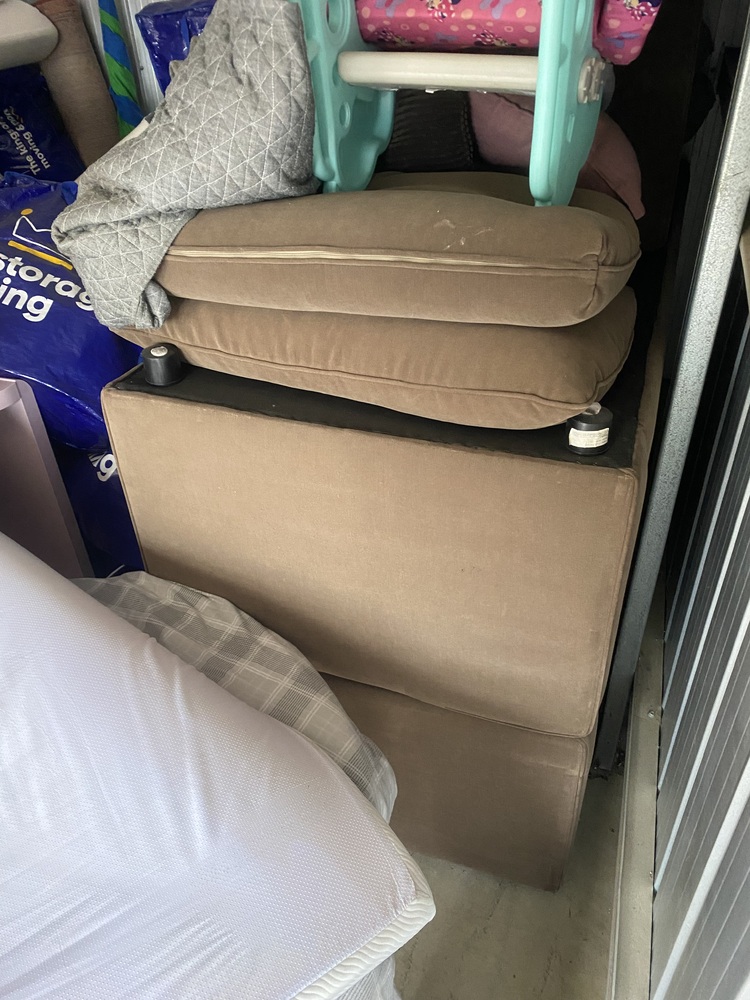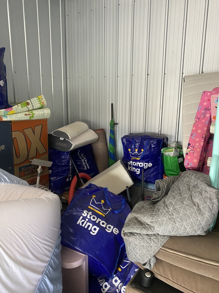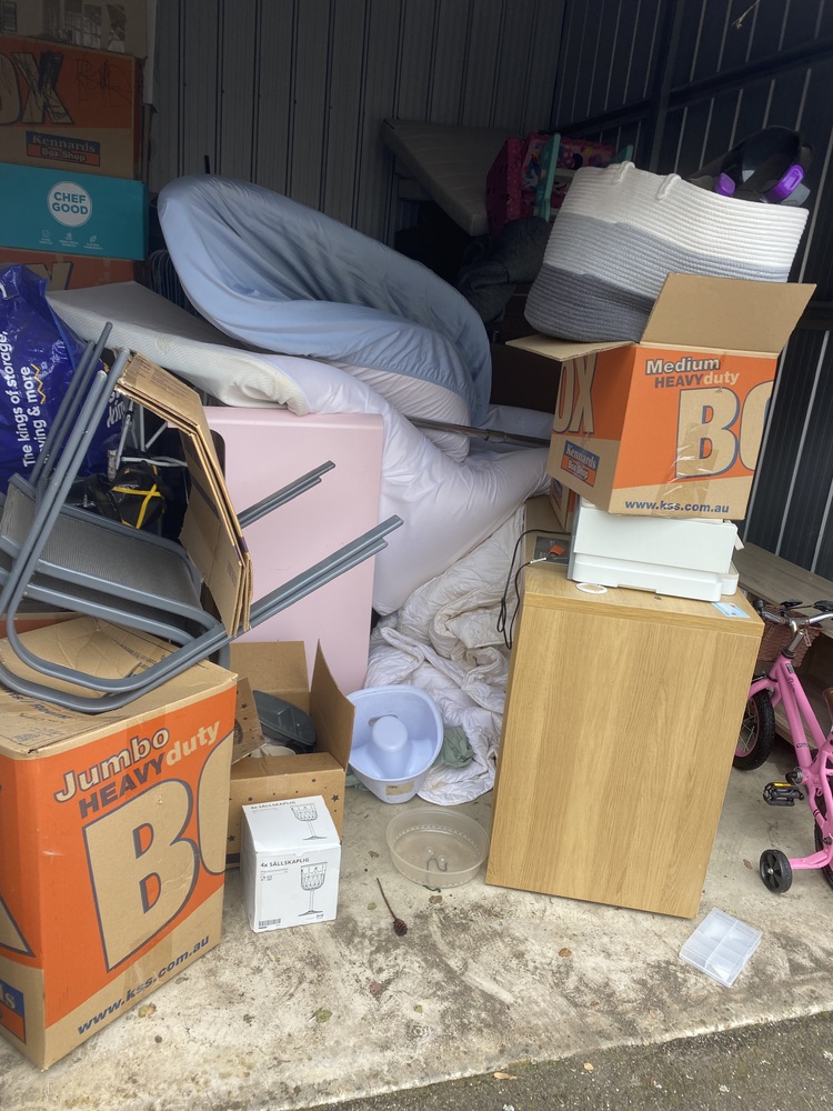 Unit with couch, cot, homewares, children's bike, kids items. Have not opened boxes deeper than the entrance,