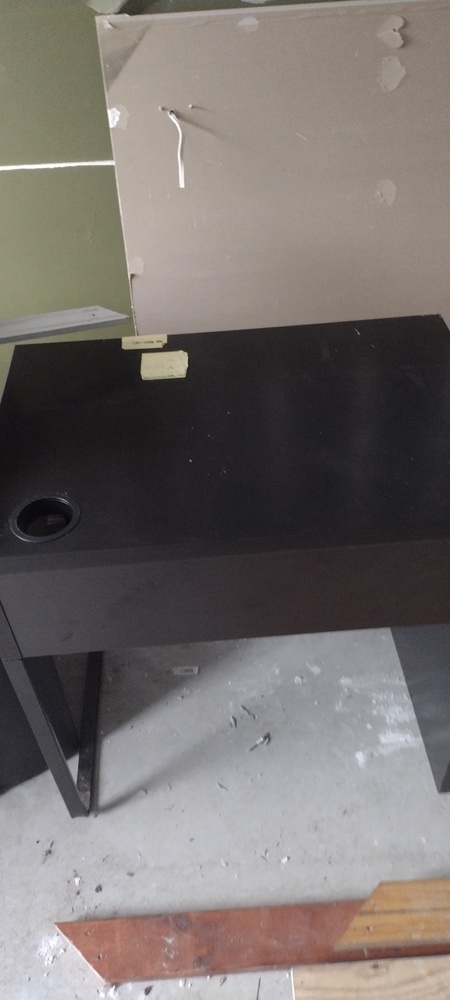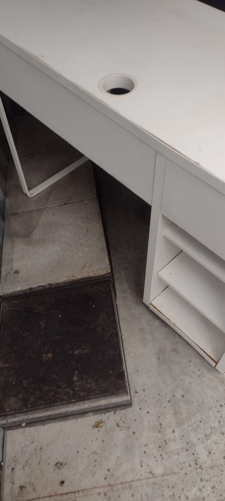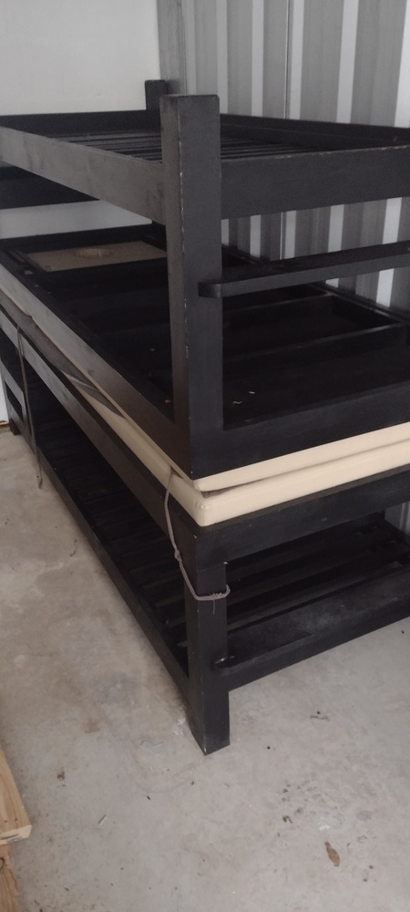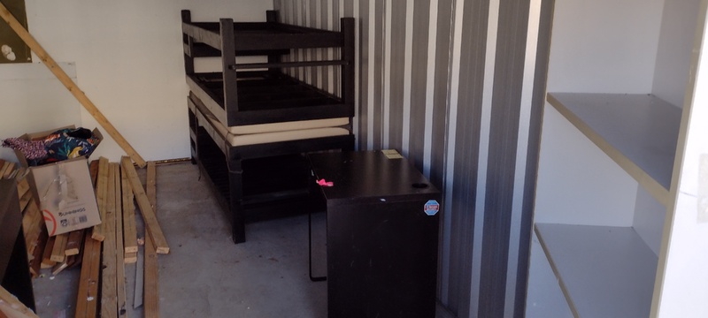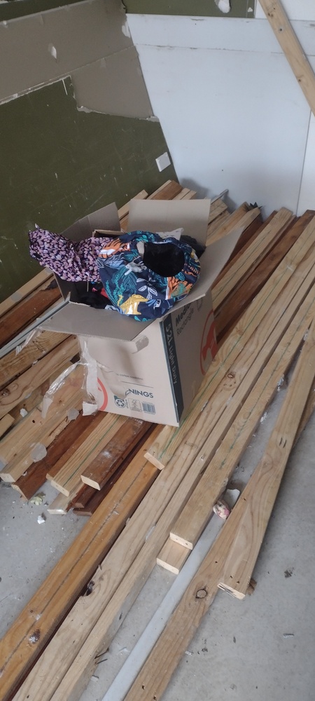 2x sofa beds, 1x white bedside table, 1x black bedside table, 1x box of linen, 1x white bookshelf, 1x couch, various lengths of timber, various pieces of fibro, various floor paving tiles.