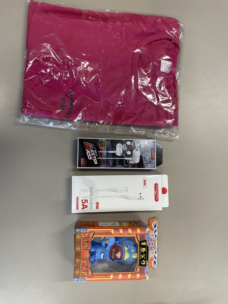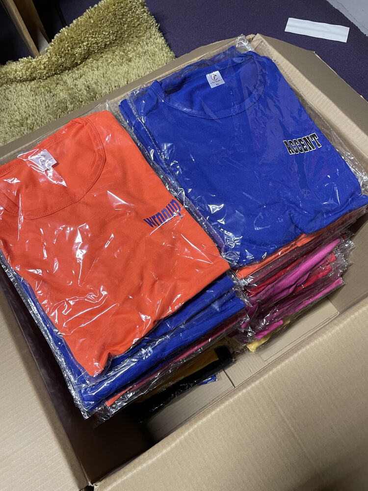 T-shirts range between XL and 3XL. Colours included: orange, light blue, dark blue, pink, green, red, yellow, black and white.
