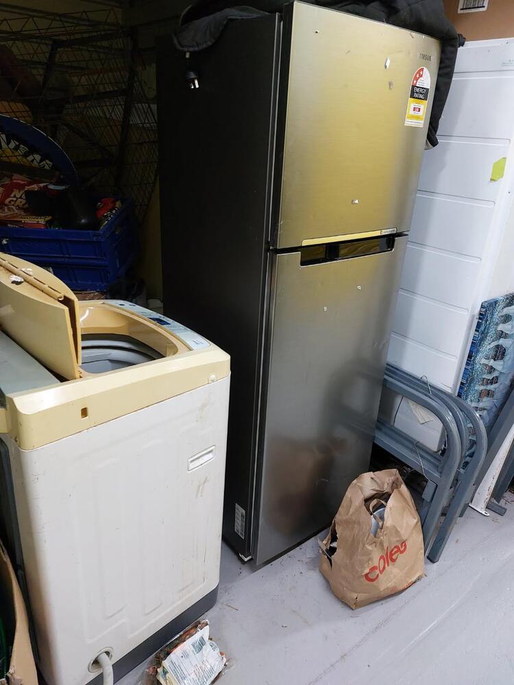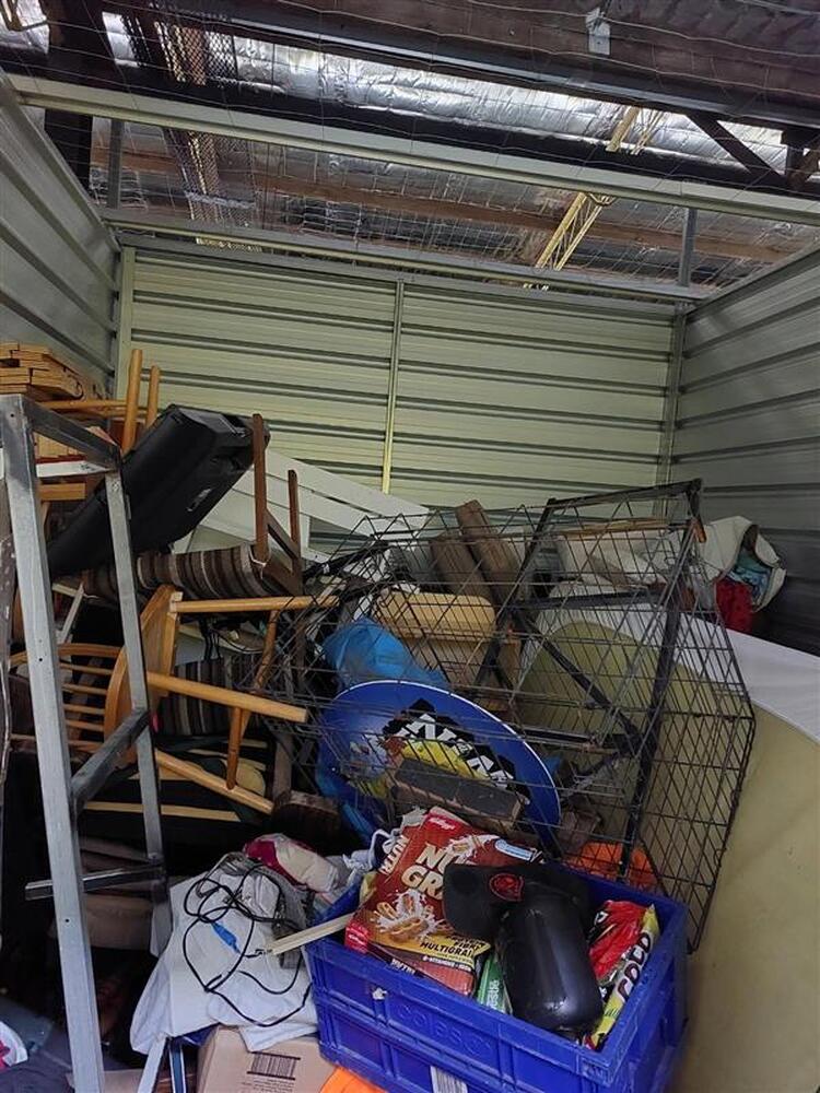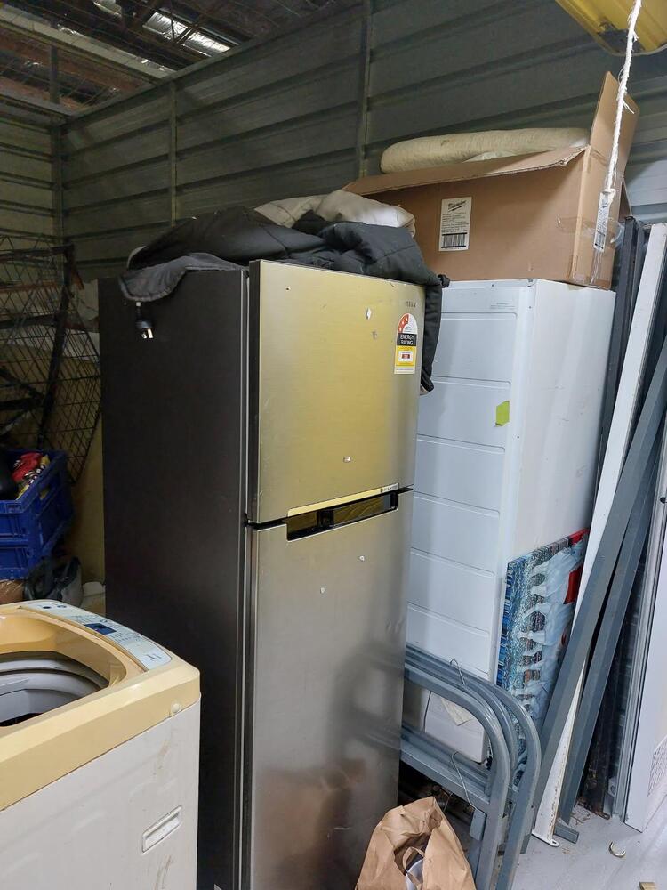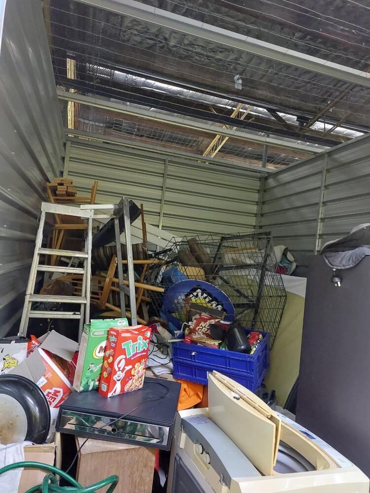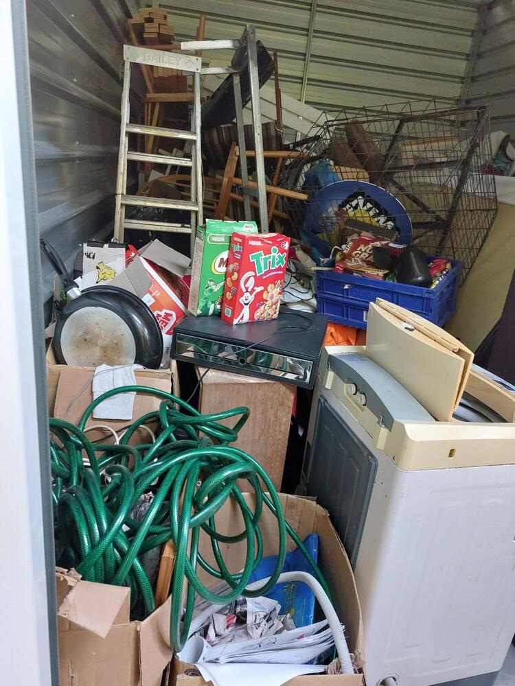 Items we can see include: Fridge, washing machine, animal cages, hoses, furniture items, Bedding, Ladder. kitchen and general Household items.