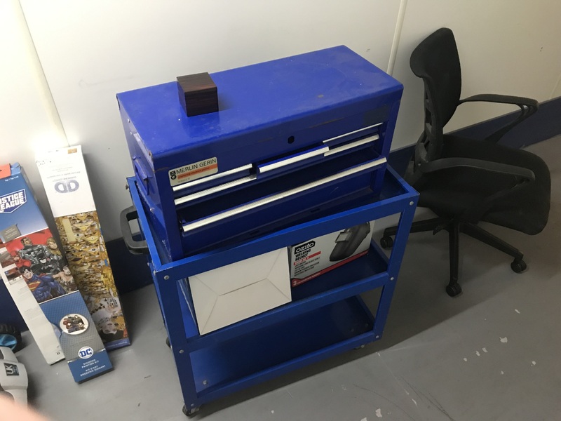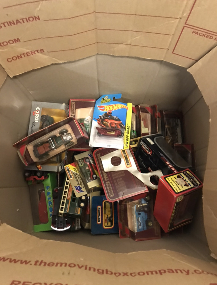 x1 Box of Collectible Cars , bbq equipments, tripod (or stands), tools, sewing miscs, fabric + beauty miscs.