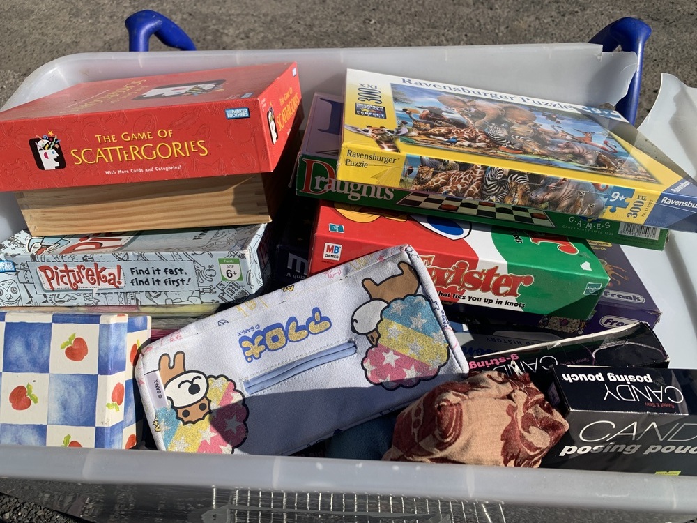 1x large tub full of mainly NEW products, including board games, ashtrays, dog leads and collars approximately 100 pieces!