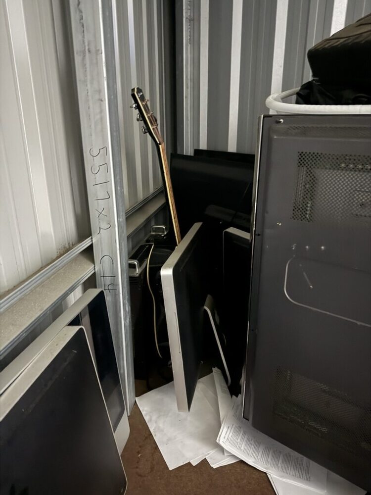 5 x Computer Screens, 1 x Large Samsung TV, 1 x Guitar, 1 x Sewing Machine, 1x Large Speaker and 1x Medium Speaker