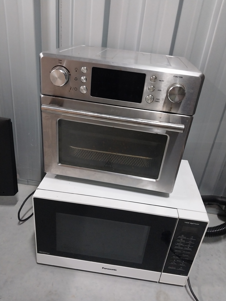 Various kitchen items - Rice cooker, microwave, pots, pans, cutlery