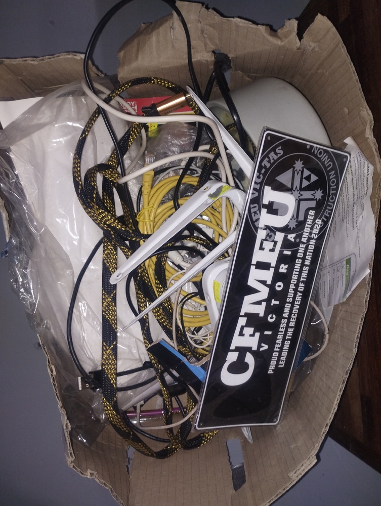 Box of assorted cables & bric-a-brac
