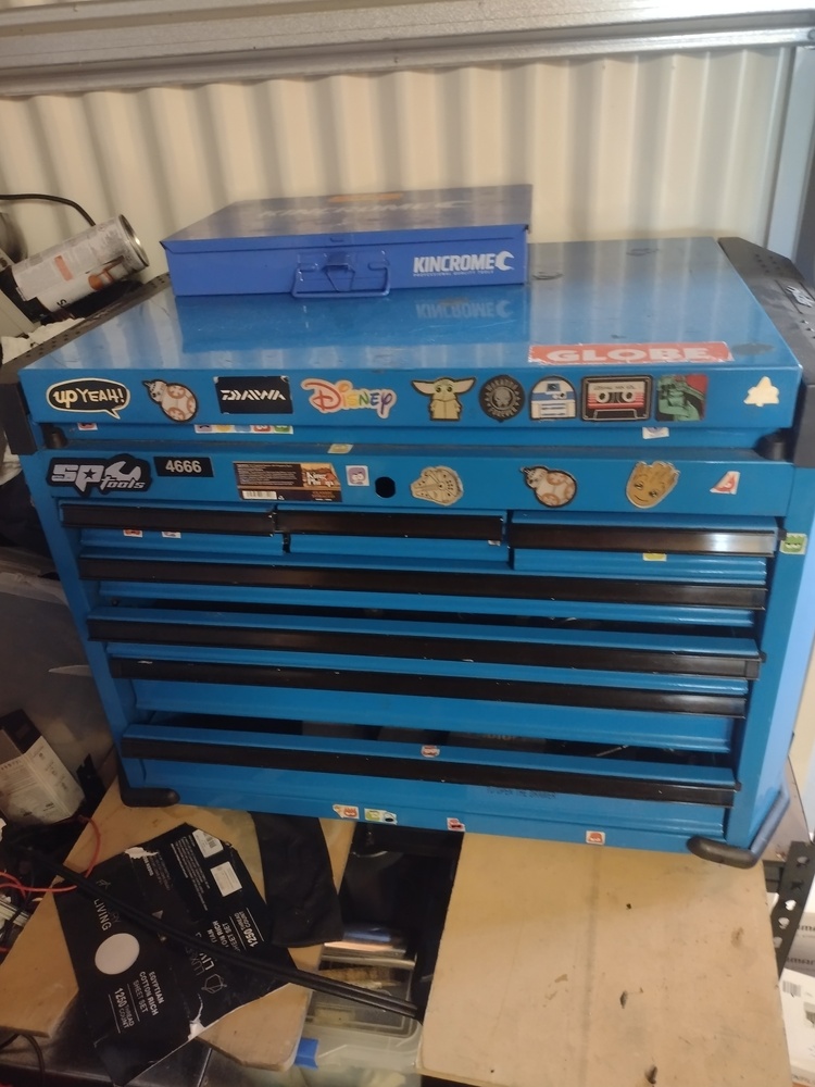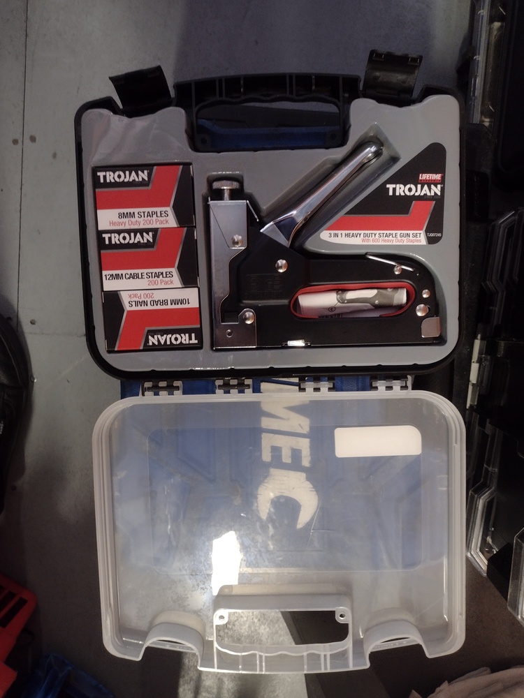 Diaphram pump, double swag, trolley, yabby nets, fuel pressure tests, spare parts containers, kincrome parts, 2 tier tool shelf, 2 X soniq xplod amps, weconick amp, recipricator saw, TV wall bracket, wave inverter, oneil bike boots, gazebo frame, 7 drawer tool box, Trojan staple gun, 2000w heat gun, coil of audio cable, 14 boxes of miscellaneous electrical, clothing, kitchenware