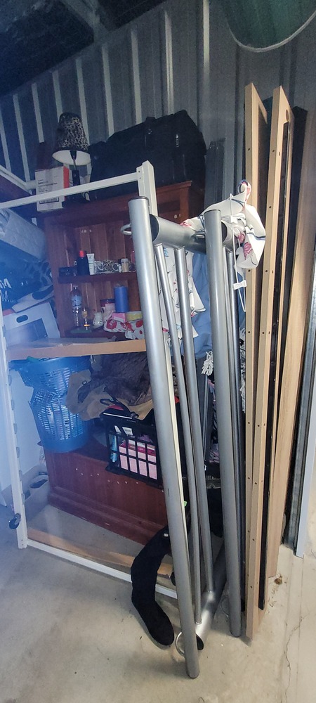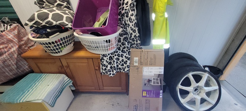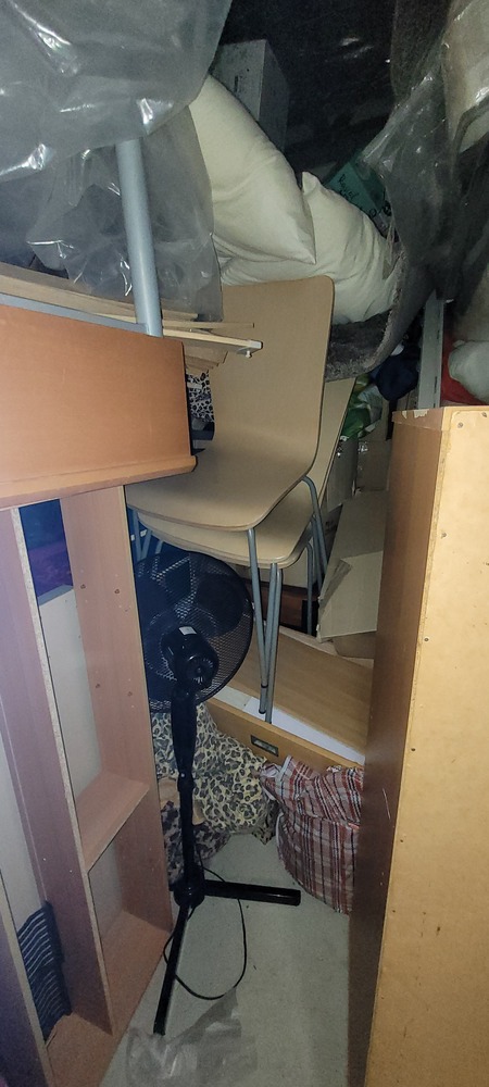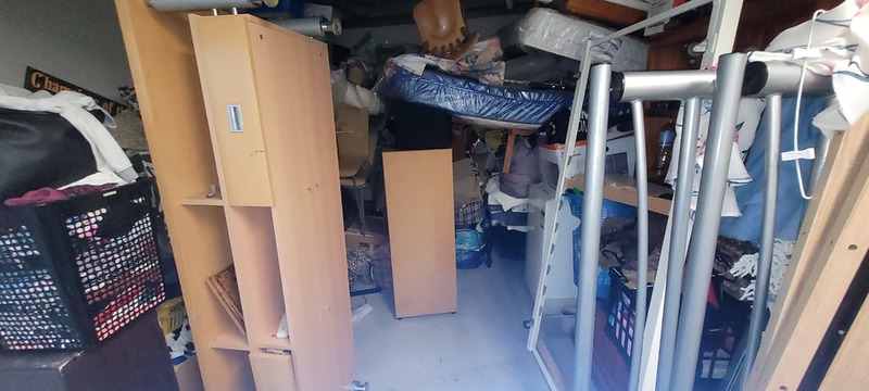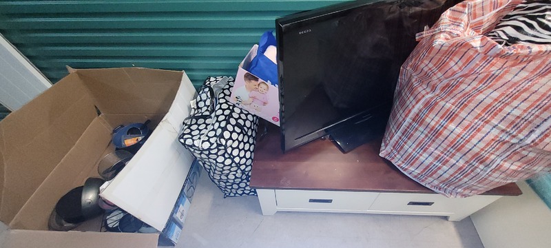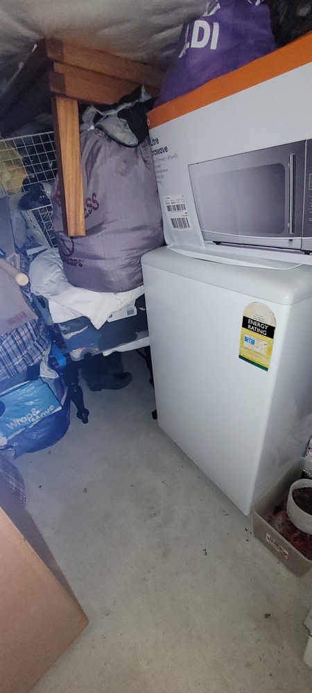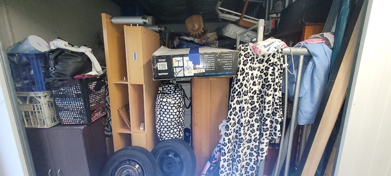 Assorted kitchenware, Tv unit, TV, Assorted bags of clothing, Bedside, Buffet, Assorted washing baskets, Ironing board, Buffet in box, Battery, Wheel & tire x 3, Cupboard, TV unit, Metal bed frame, Metal trundle frame, Timber bed frame, Buffet hutch, Assorted milk crates, Washing machine, Coffee table, DVD stand, Bedside, Dining chairs x 3, Dining chair x 2, Coffee table, Mattress x 3, Assorted wire baskets, Bar stool, Bookcase unit, Assorted unopened plastic containers, bags & boxes, Rug x 2, Fishing rod, Assorted household items, Lamp, Fan, Speaker box, Umbrella, Suitcase, Glass tabletop & Assorted manchester.