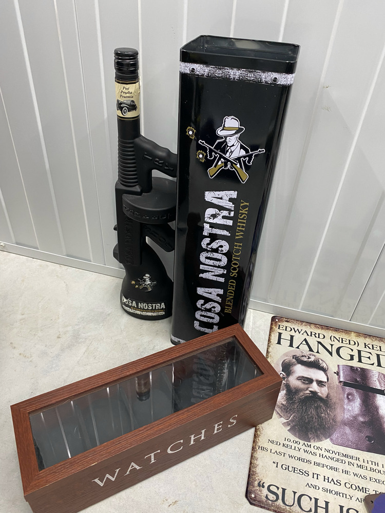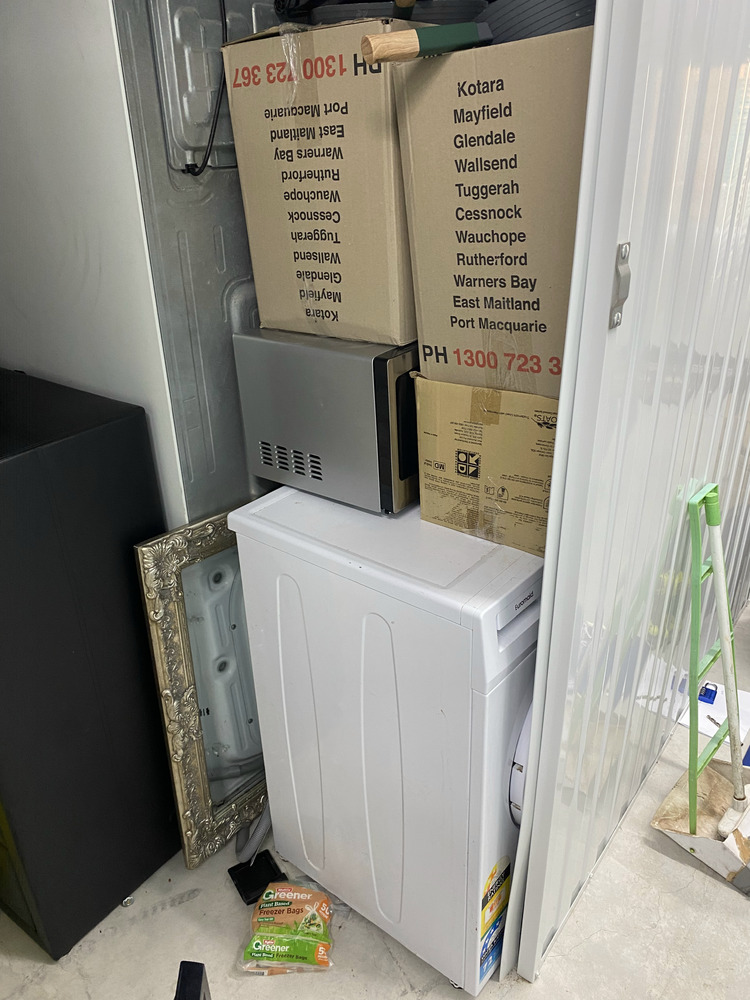 Television, Fridge, Washing Machine, Microwave, Lounge, Coffee Table, 2 x Tallboys, 2 x Bags of Linen, Bed Frame, Mattress, Lamp, Cooking Items, 2 x Containers of cooking items, Bag of Cushions, Vacuum, Box of Toiletries, Light, Metal Pictures, Watch Storage Box, Bottle of Scotch, 2 Cane Chairs, Box of Clothing