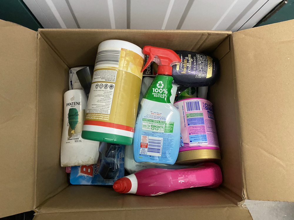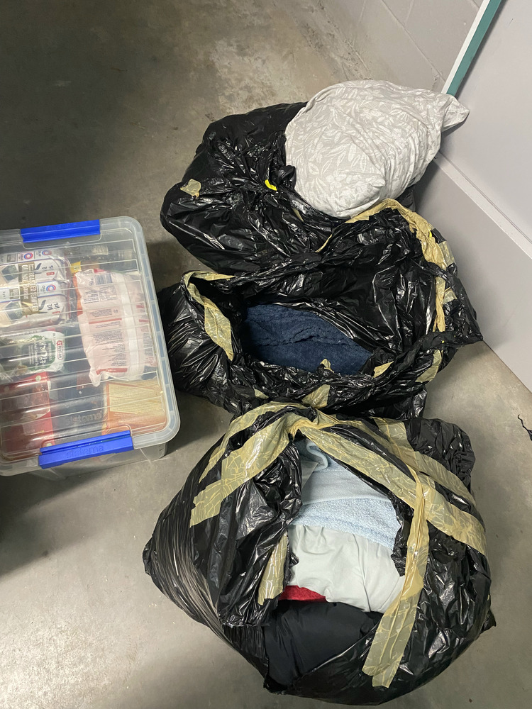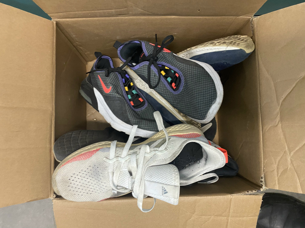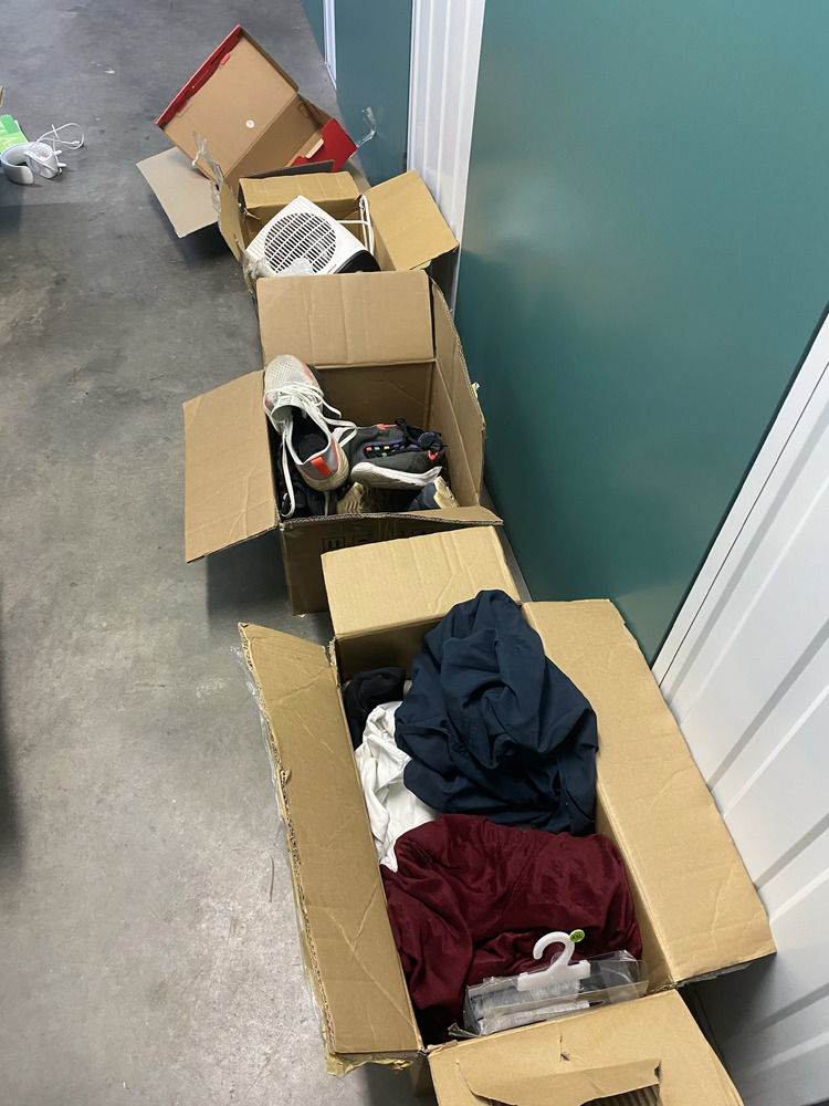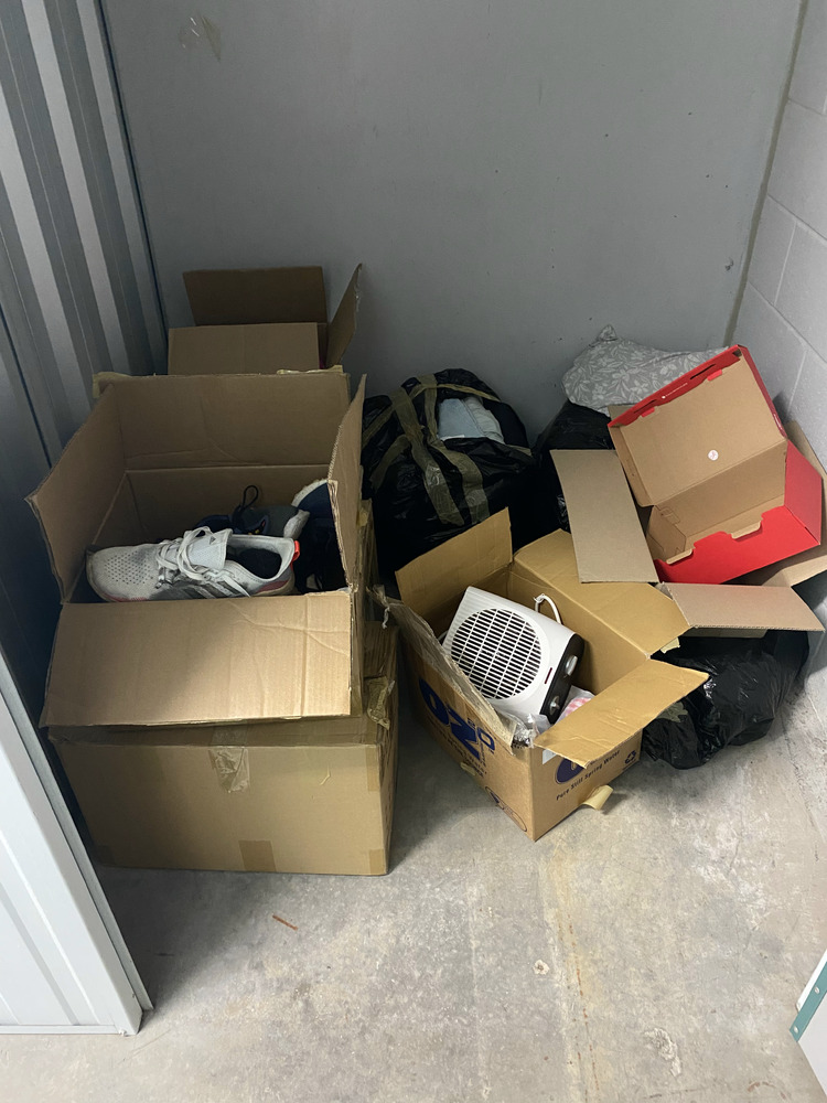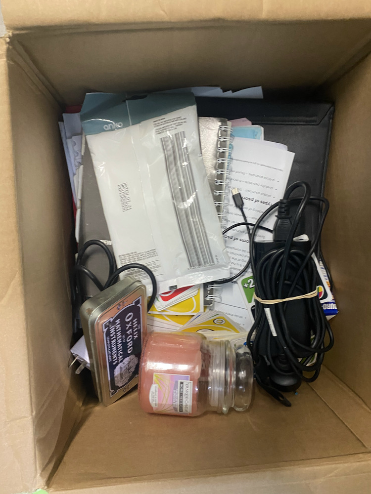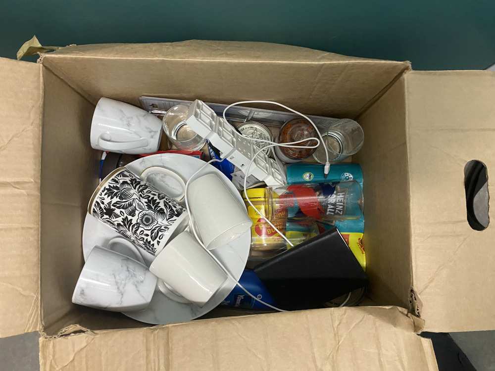 Box of Assorted Shoes, Bike Phone Mount – New, Carry Bag, 3 Plastic Bags with Pillow / Linen / Towels, Container of Food items, Box of Clothing, Small heater, Charger unit, Books, Assorted Paperwork, Box with Candle / Charger, Mathematical Instruments, Box of assorted Crockery / food items, Box of Laundry items and Toiletries