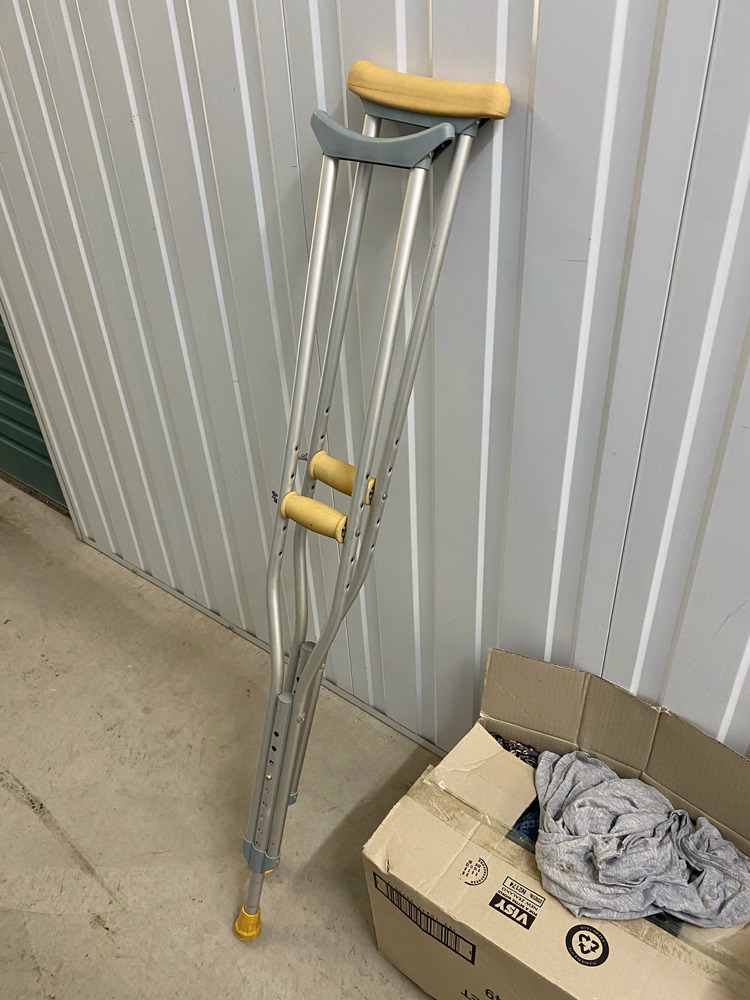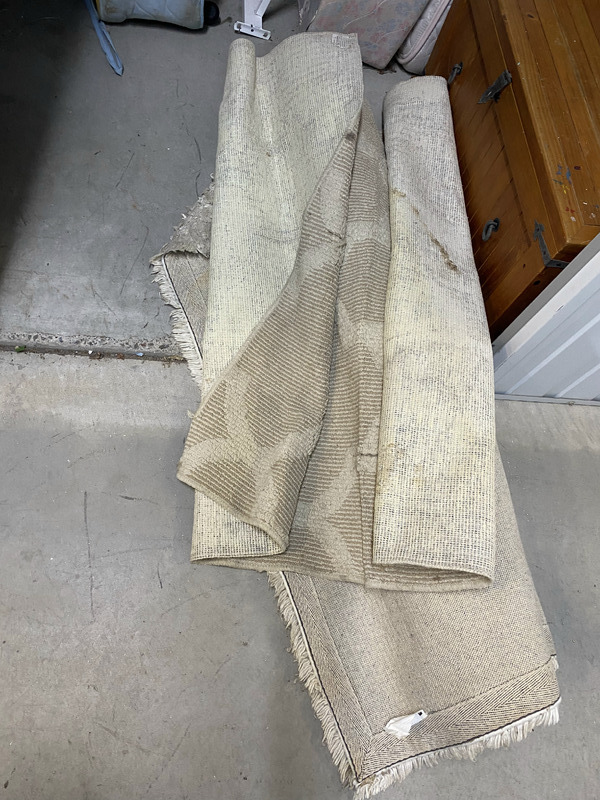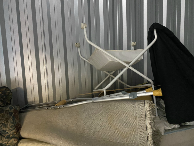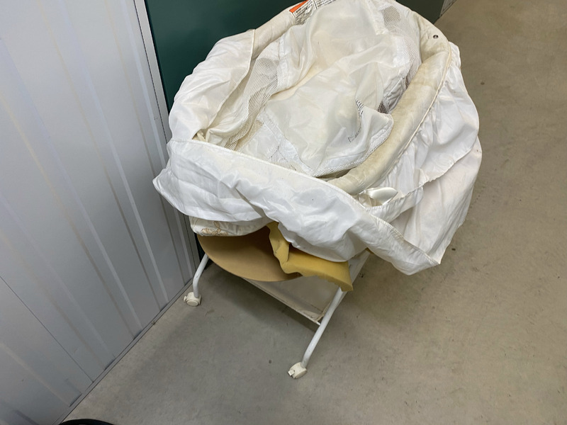 Timber Chest with assorted Toys, Bed Frame, Assorted boxes of Clothing / Linen, 2 Rugs, Childrens Bassinet, 2 Bed Bases, 4 Mattresses, Bag with Shoes / assorted items, Crutches