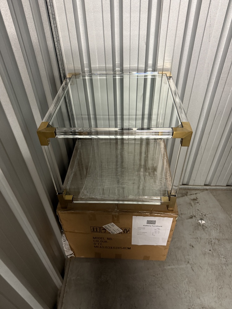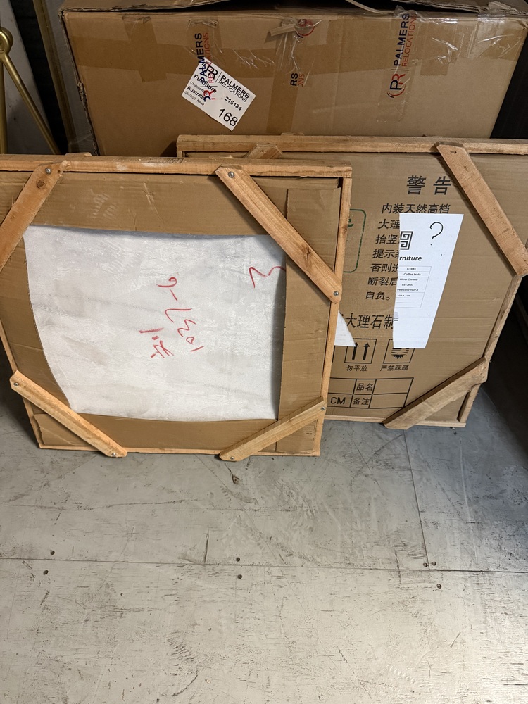 2 x glass side tables, 1 x long hall table(metal base glass top), 1 x bedroom chair (yellow fabric), pair of grandfather winged chairs (orange fabric shaped legs), 2 x marble tops (aprox 50CM square) each. All new items.