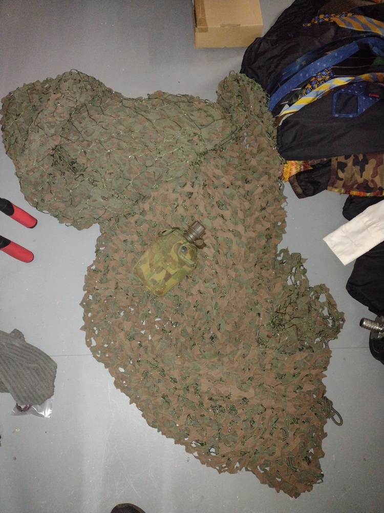 Camouflage net, canteen and jerry can