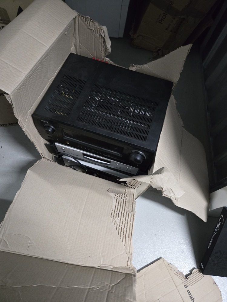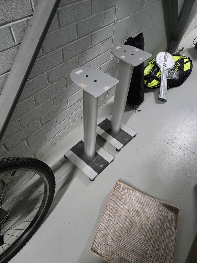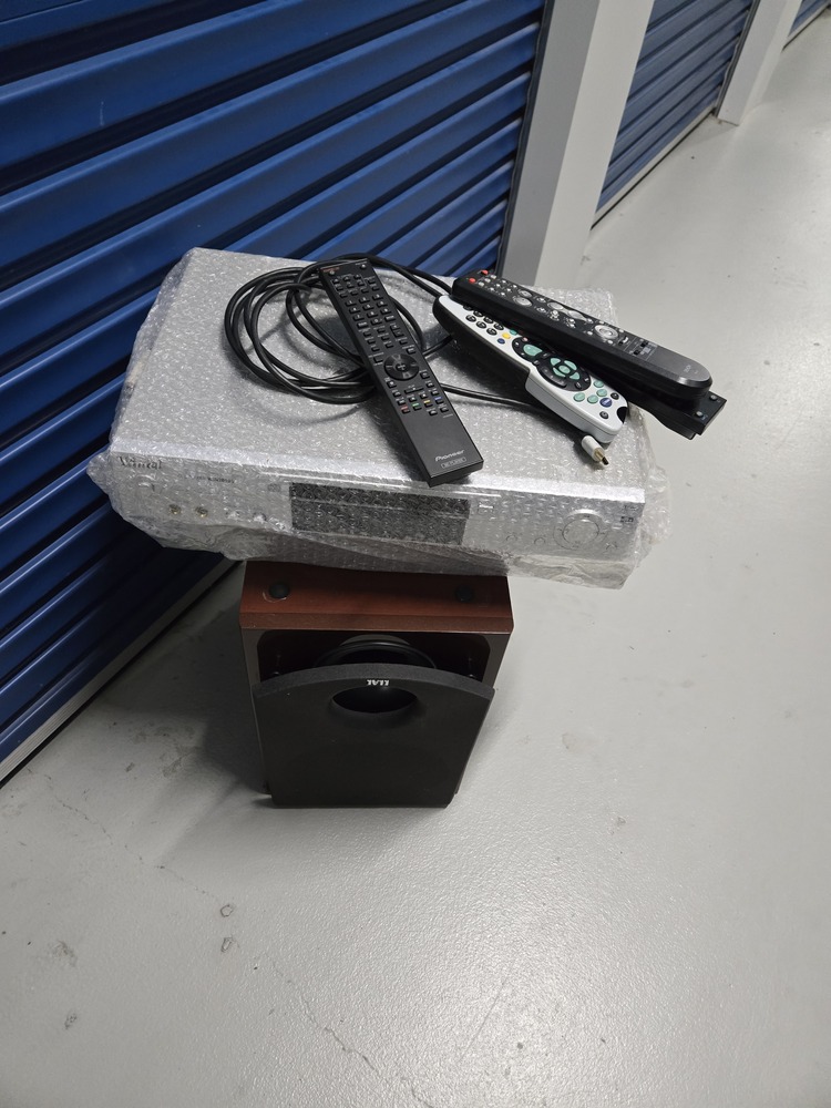 Various electronic goods like a DVD player and sound system, also what looks like speaker stands etc.