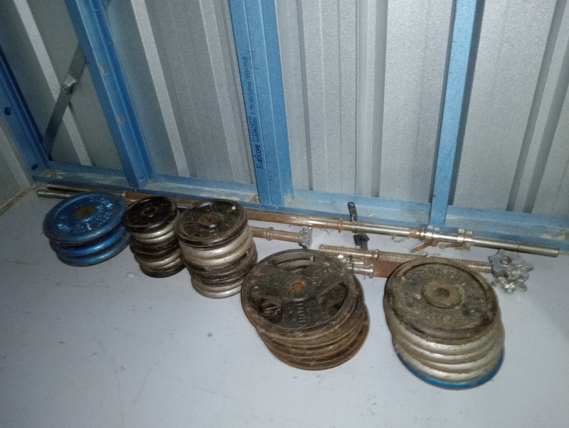 Assortment of weights, barbells and collar