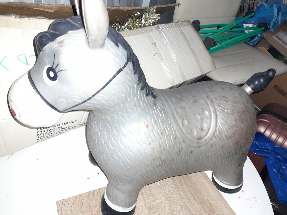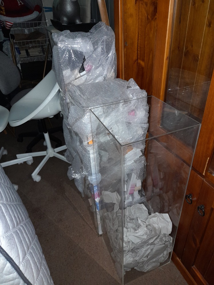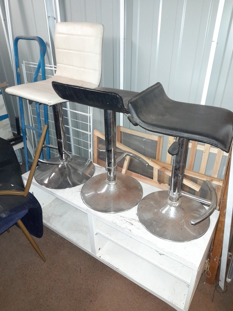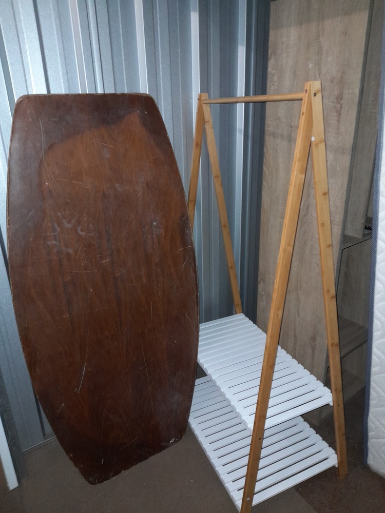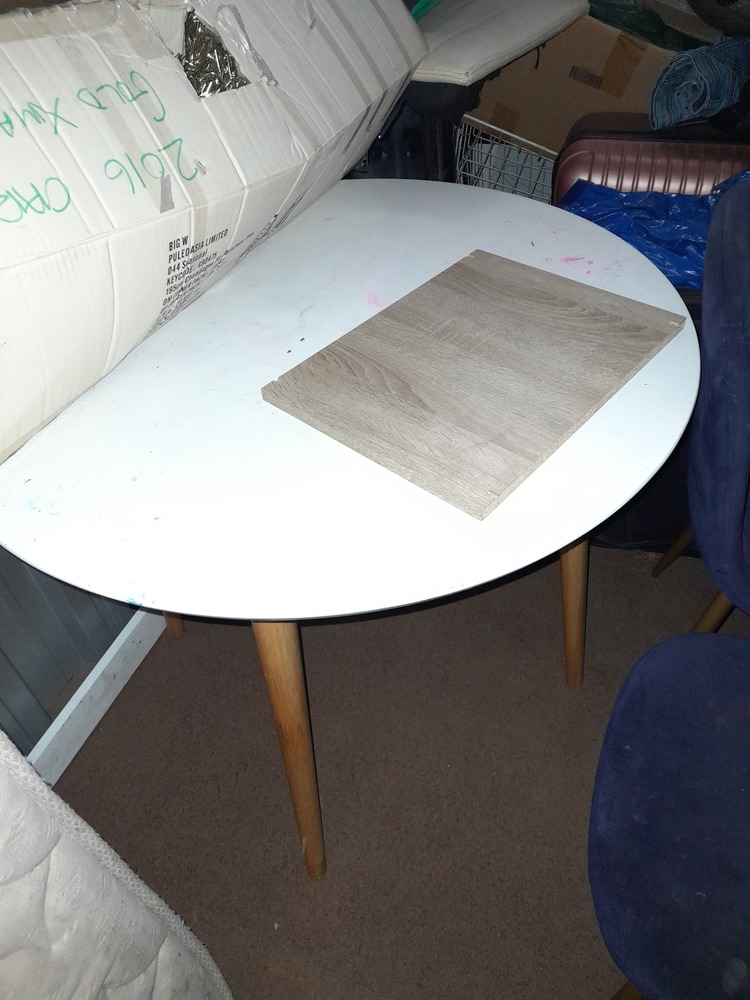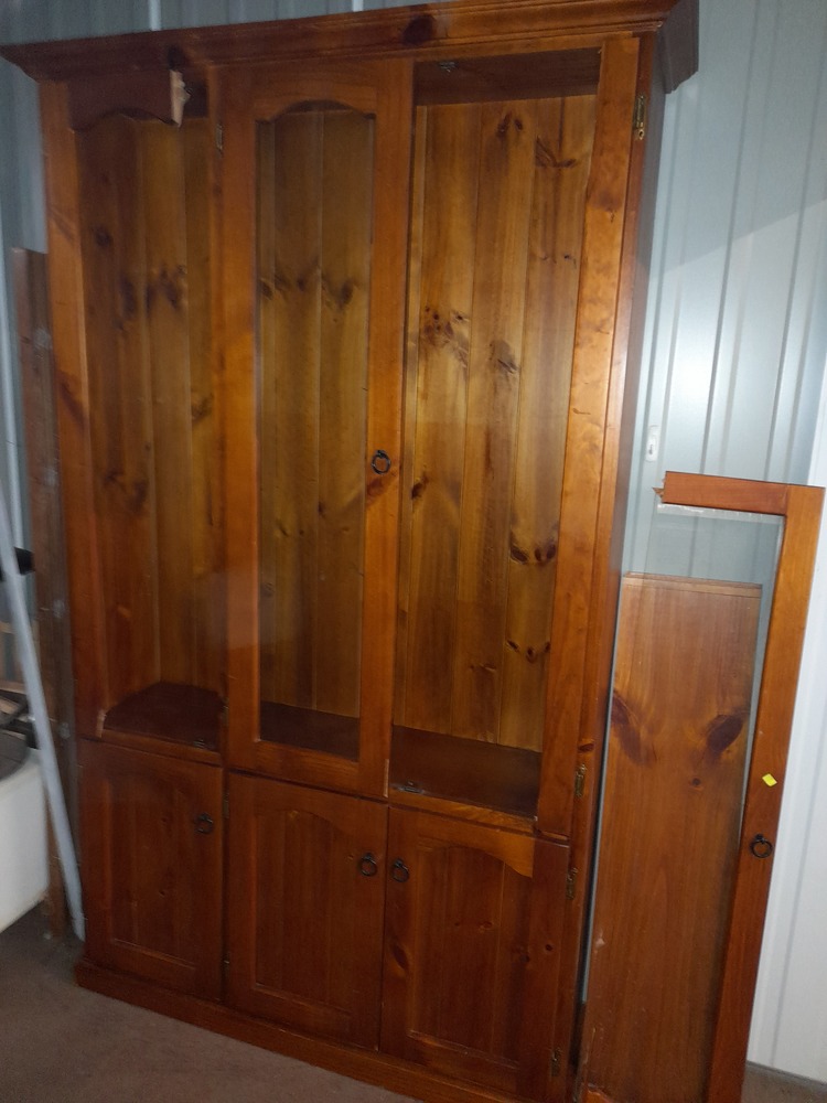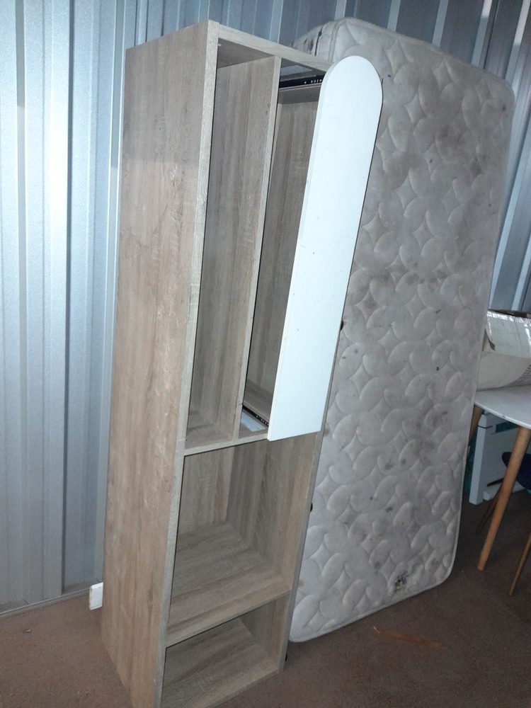 Furniture, mattresses, bed frames, dining table, chairs, bar stools, China cupboard, coffee table, clothing racks, shelving, couple bags of clothes, kid's toys, canvas prints and a Christmas tree.