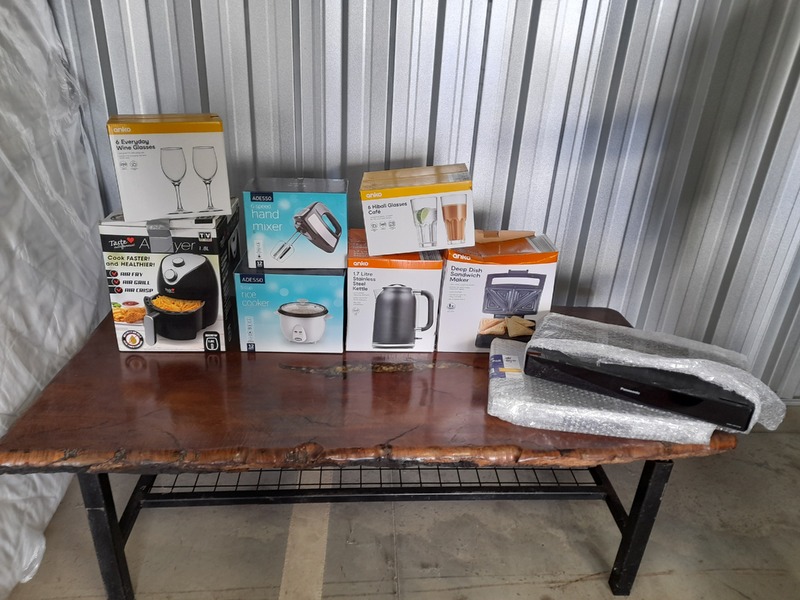 Yamaha 660c motorbike with 3 helmets, Blue lounge, LG top load washer, Black Hisense bar fridge, Proflex gym and barbells, Gym ball, Bowling ball, Large wheel arches x2, Mattress with bases, Wooden top coffee table with resin inset, Panasonic TV & TV recorder, LG TV, DVD players, 2 Door small cabinet, Wheel chair, crutches, 2 Walking sticks, Shower chair, Asst golf clubs, Rice cooker, Air fryer, Kettle, Sandwich maker, Hand mixer, wine & hi-ball glasses, Asst kitchen items, 2 speakers, Cloud Mesh wifi broadband, Single air mattress & pillows, Small photo frame, Bedside takble with 1 drawer, Set of 2 wooden coffee tables, Dart board in cabinet, Shot glass chess set with glass board, Asst safety glasses, Hi-Vis clothing, Bog beds & foldable dog ramp, Rear seat canvas cover, Mop with bucket, Broom, Box of masking tape, Set of 2 sheer grey curtains, Box of asst shoes/boots/slides inc Jordan sandshoes, Misc clothing in zip bag, Black zip bag.