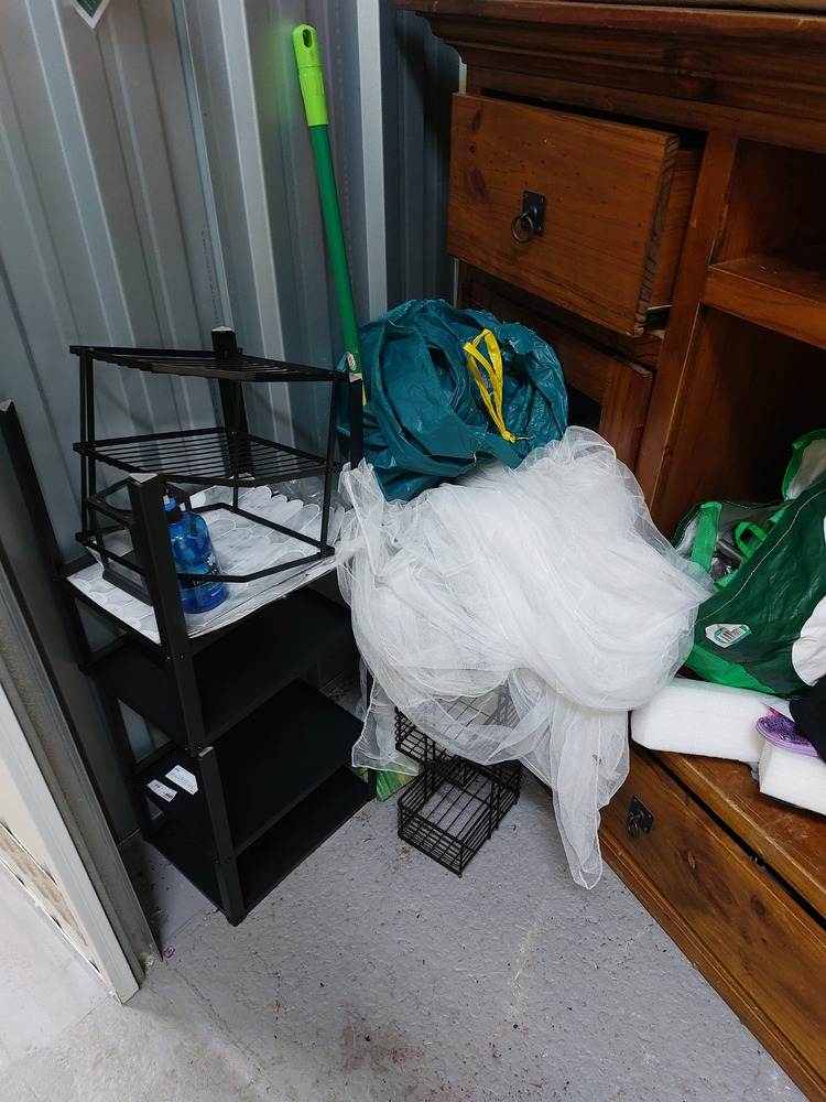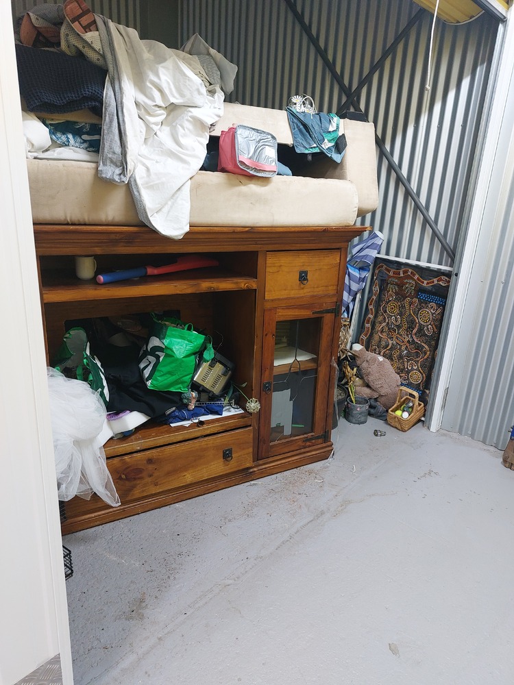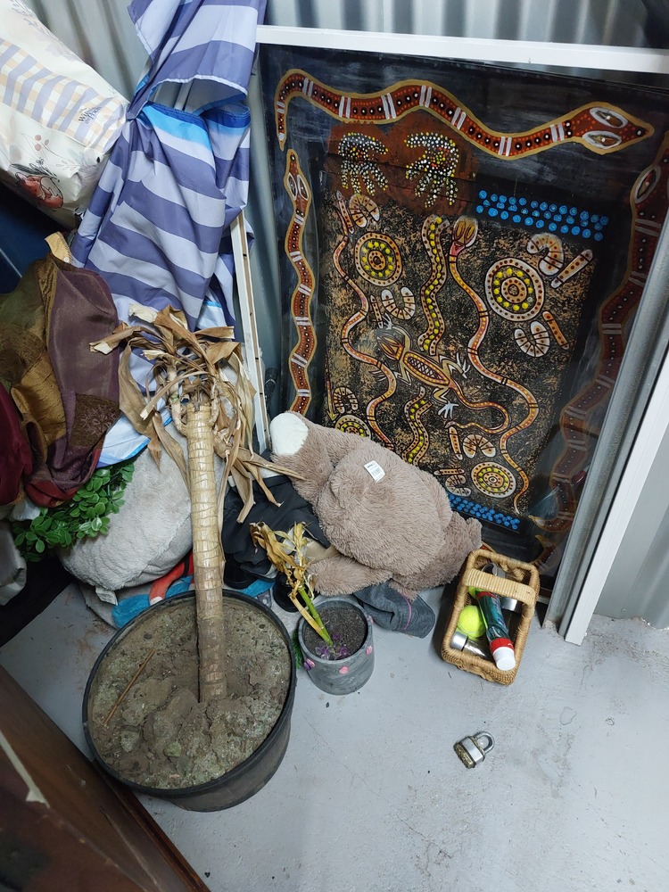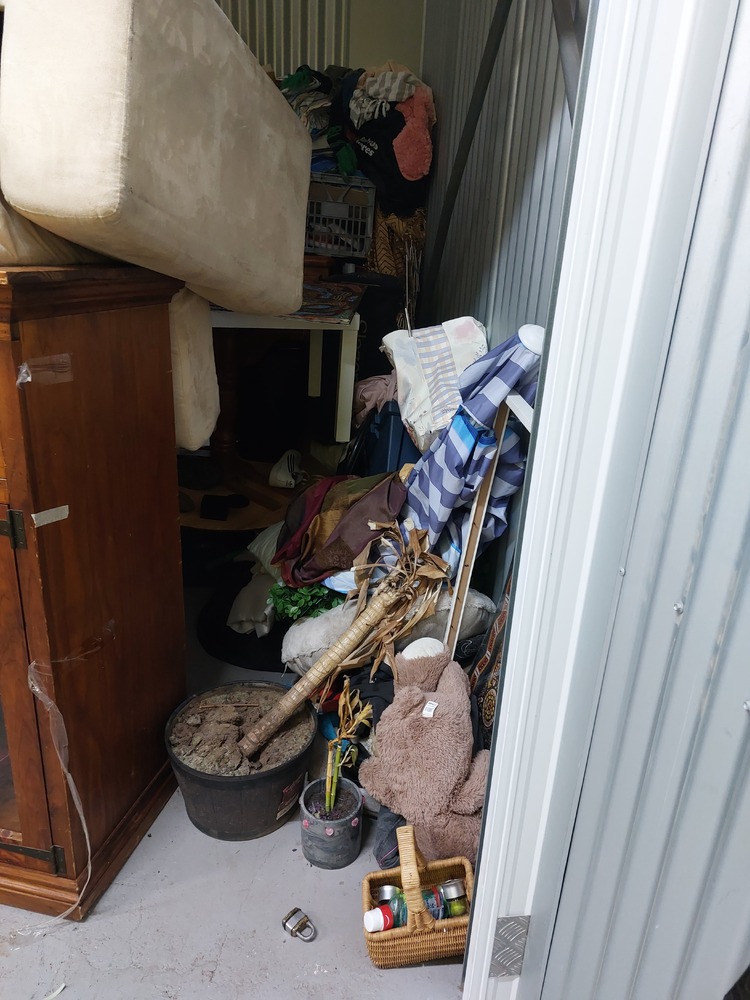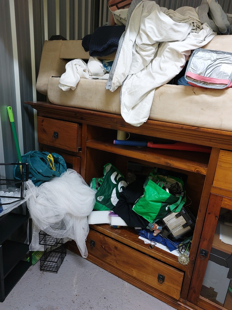 From what we can see inside this unit we have, Wooden TV unit, artwork, vase, fridge, wooden drawers and lots of boxes/bags full of stuff. We could not see all the way in so who knows what else might be in this unit…
