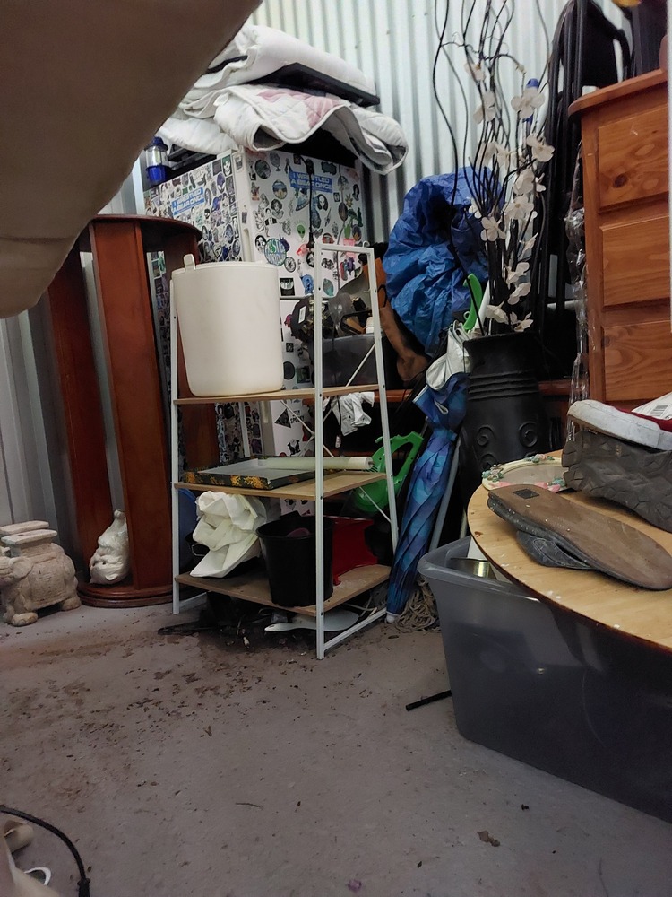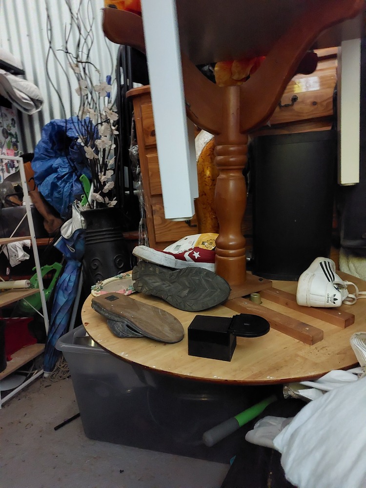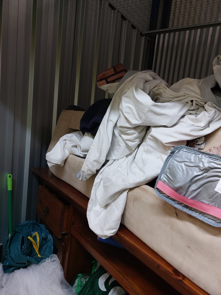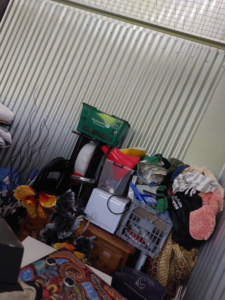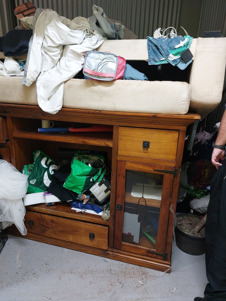 From what we can see inside this unit we have, Wooden TV unit, artwork, vase, fridge, wooden drawers and lots of boxes/bags full of stuff. We could not see all the way in so who knows what else might be in this unit…