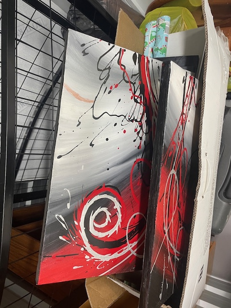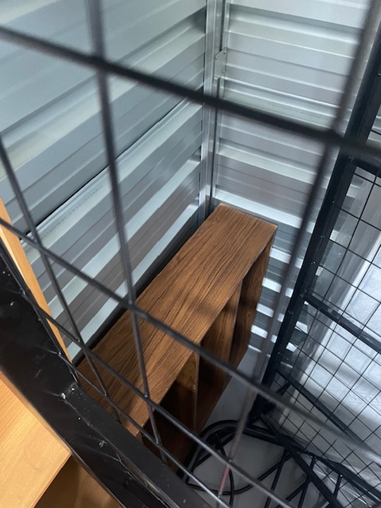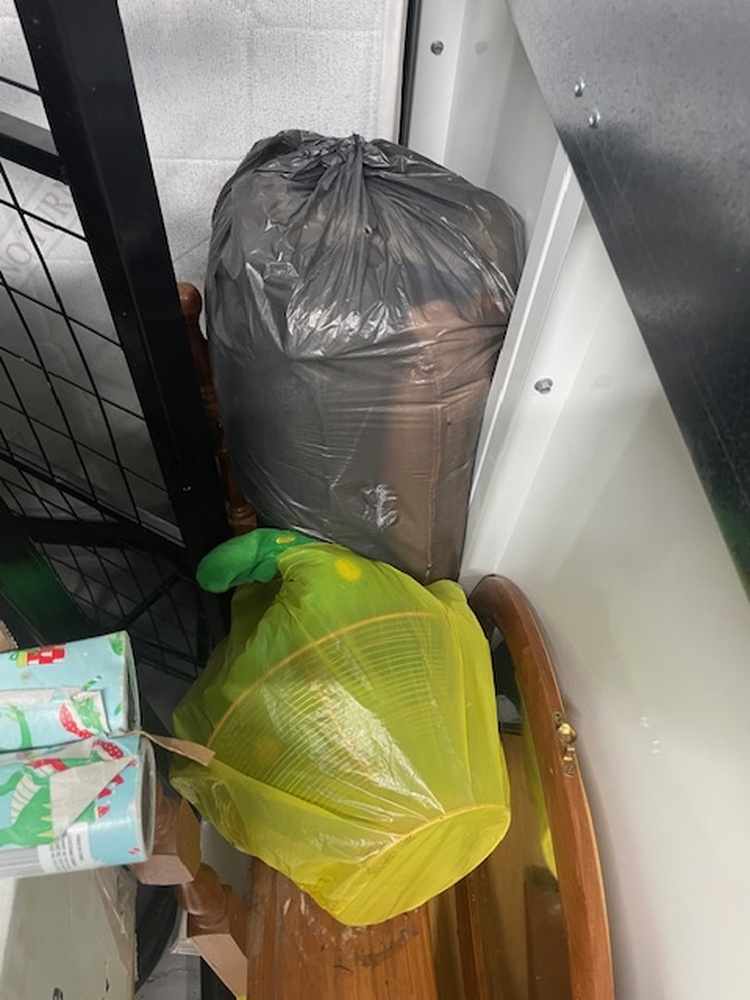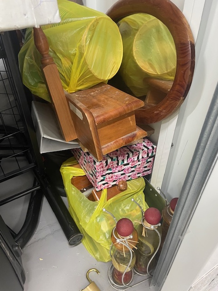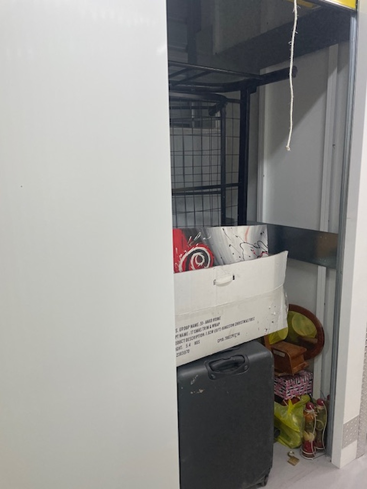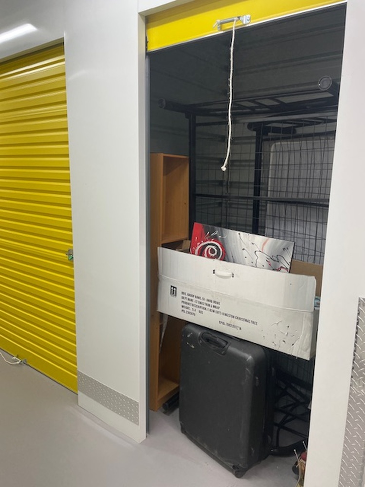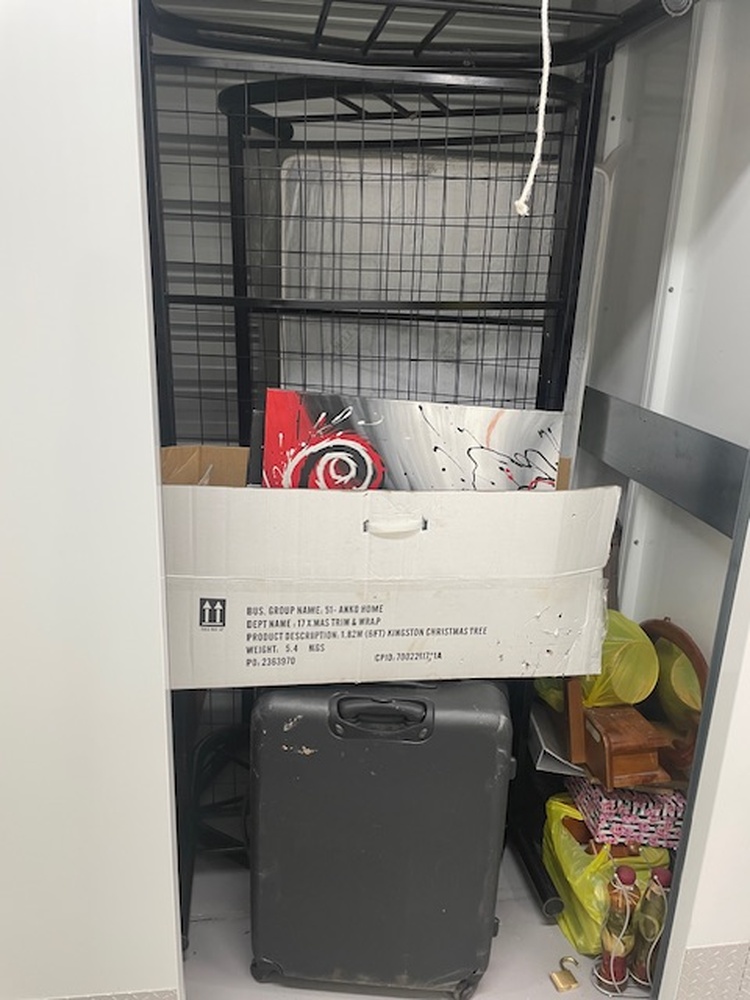 From what we can see inside this unit we have, paintings, shelfs, bedframe, a suitcase, and lots of boxes/bags full of stuff. We could not see all the way in so who knows what else might be in this unit…