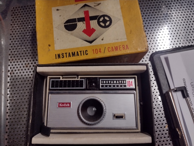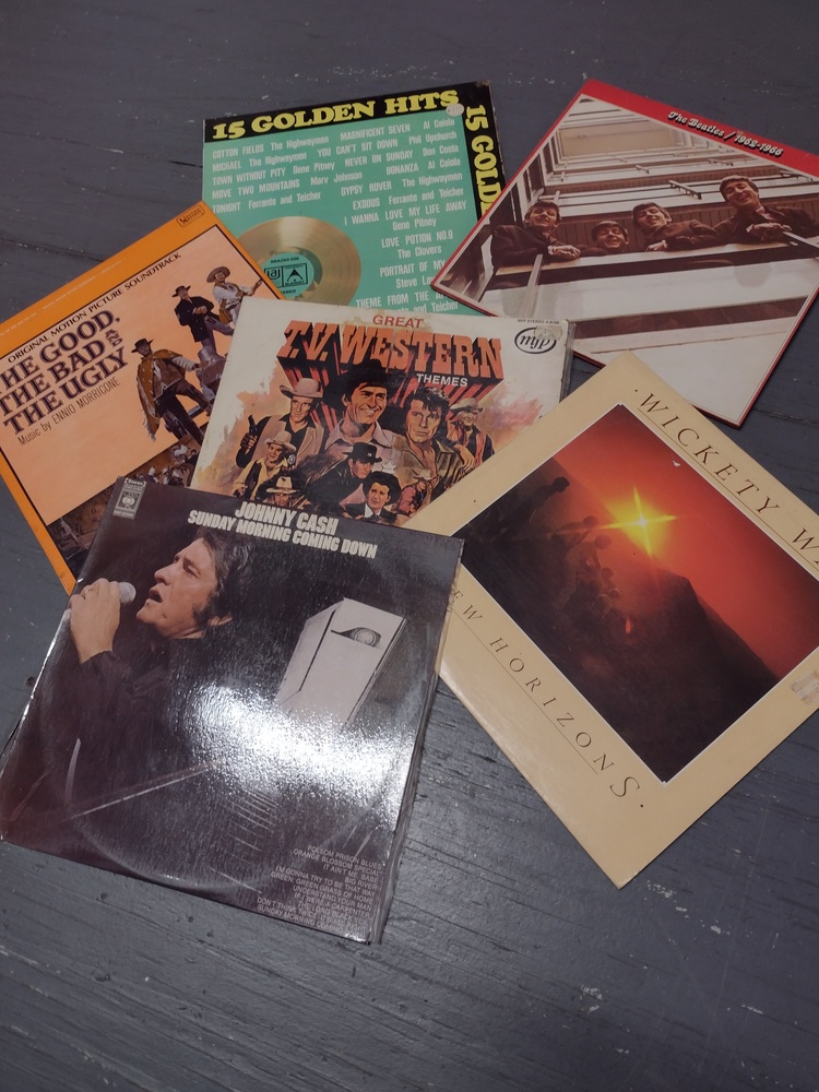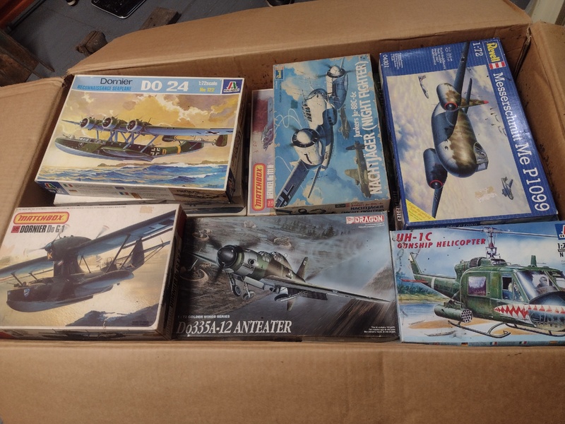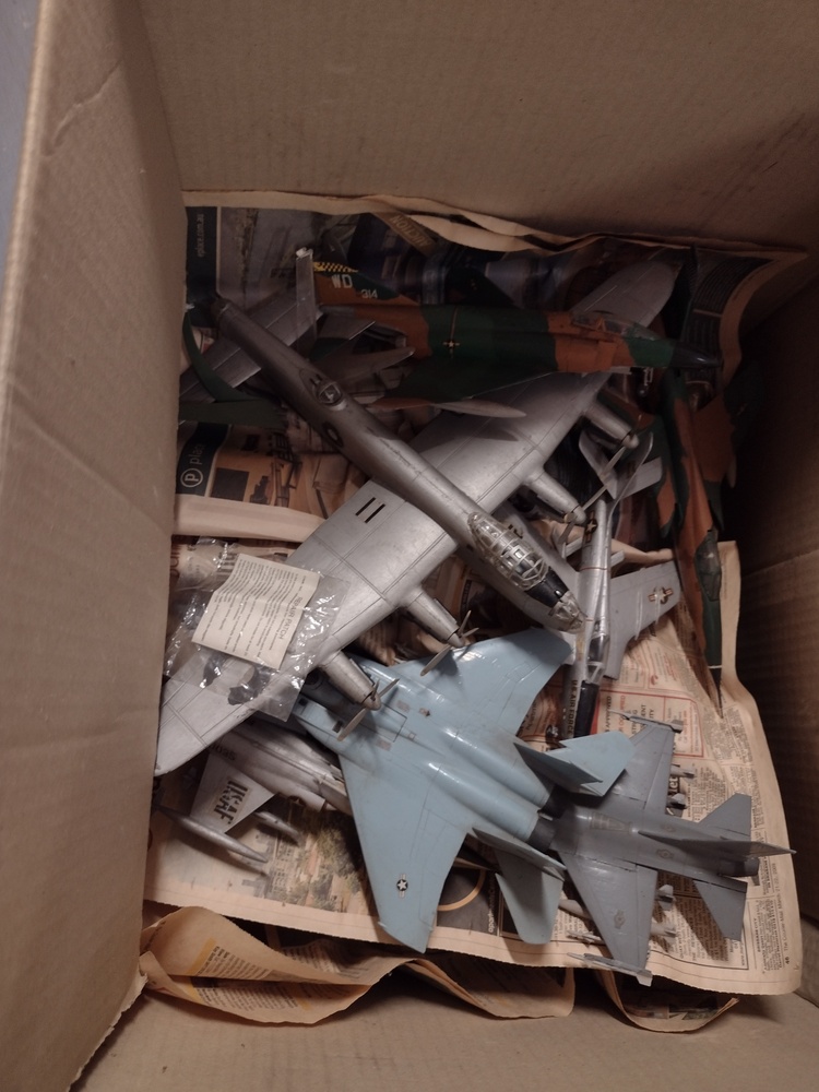 Timber box with assorted records, model planes and 4 osram flood lights inside