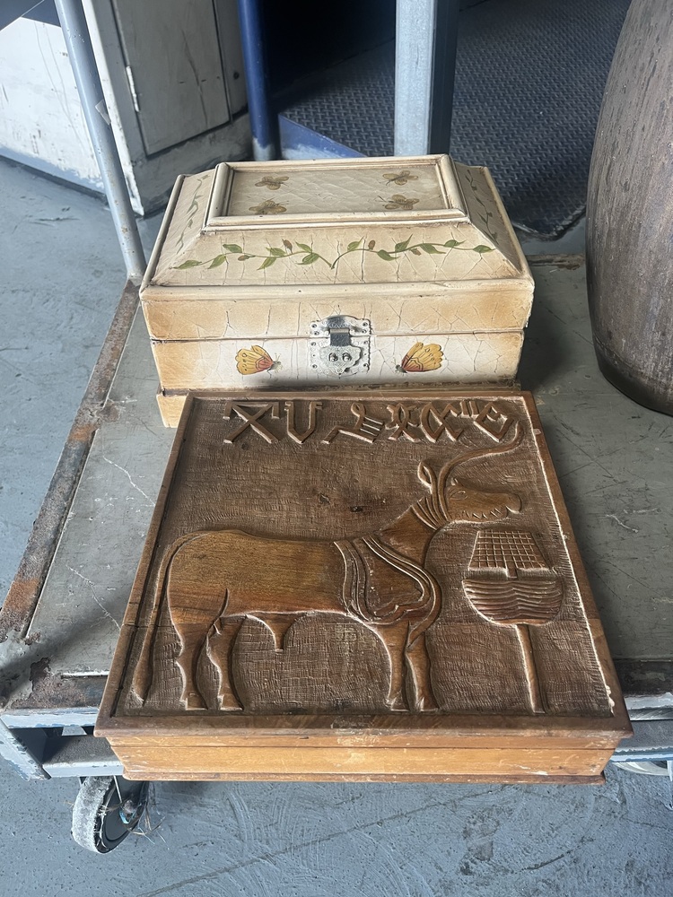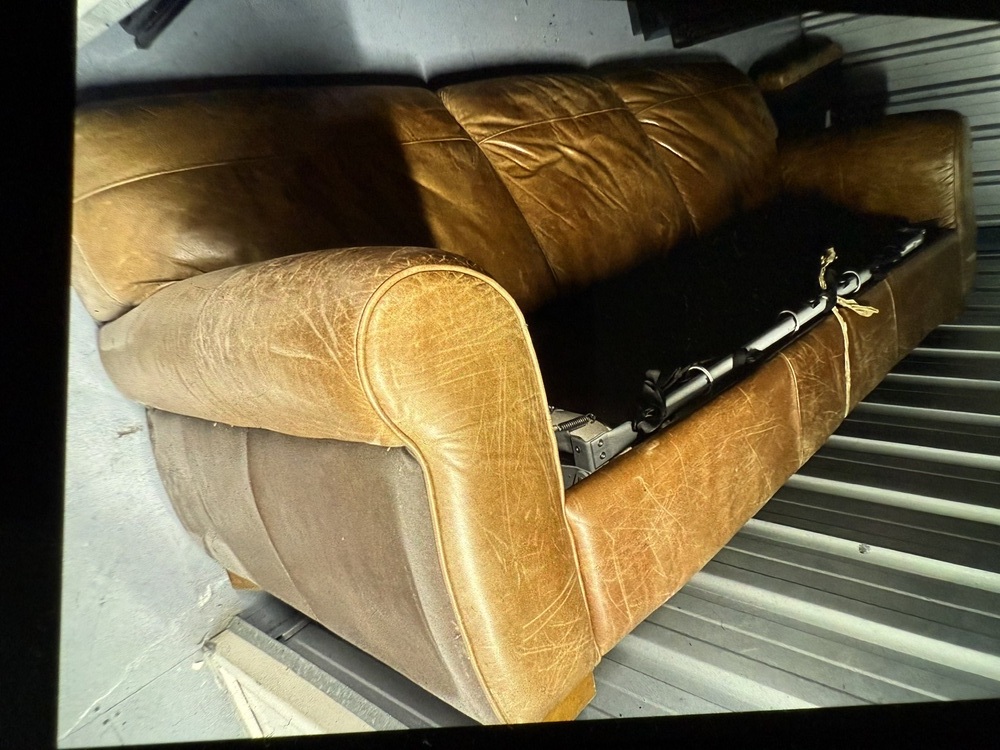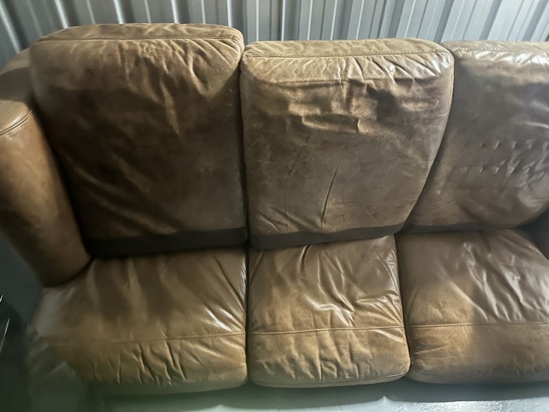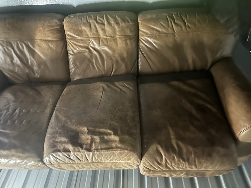 Leather 3 seater bed settee, outdoor table & chairs, new queen bed base, 2 x single mattresses, metal half round hall table with glass top, old leather couch (needs recovering), many cartons (unknown), vase ,folding chairs, large mat, 2 old jewelry type boxes.