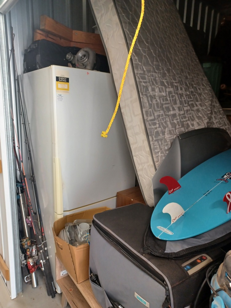 fishing rods, mattress, washing machine, fridge/freezer, misc boxes, surf board, plastic tubs