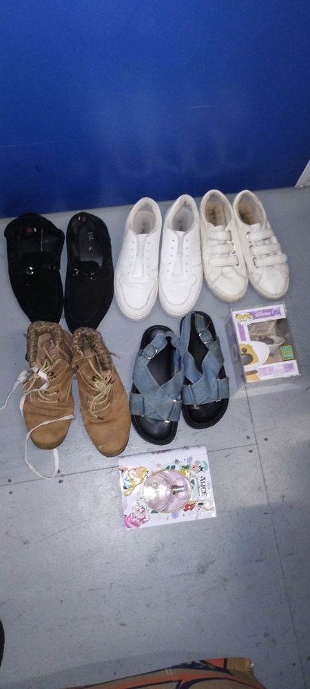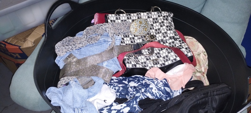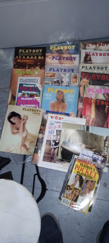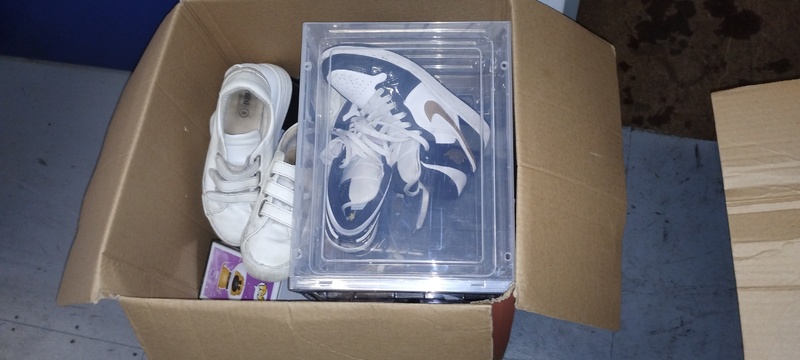 Nike Air Jordan, Old Playboy Magazines, Antique Clock, Roller Skate Shoes, Fridge, Washing Machine, Box of Assorted Clothes, Belts and Bags. Box of DVDs, Boxes of Kitchen Utensils, Paxman Printer.