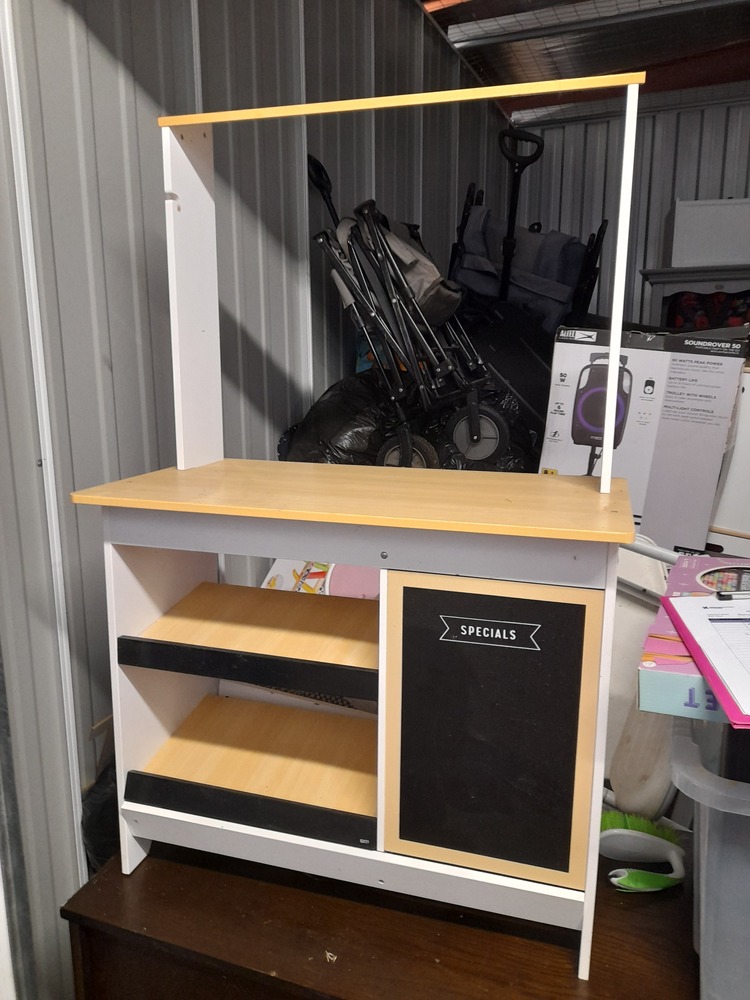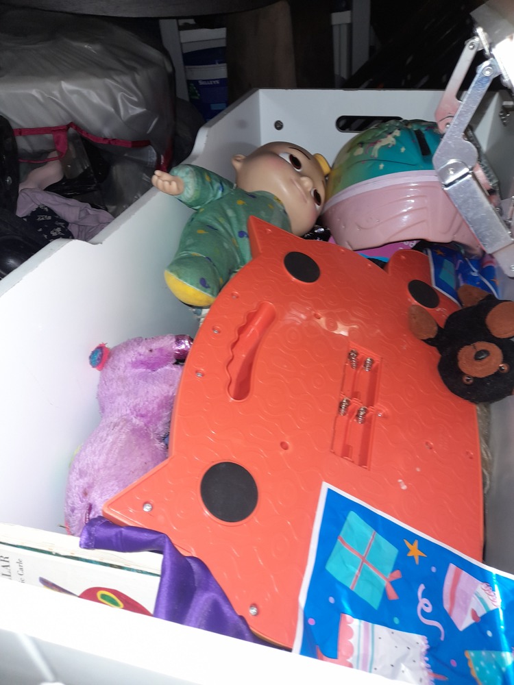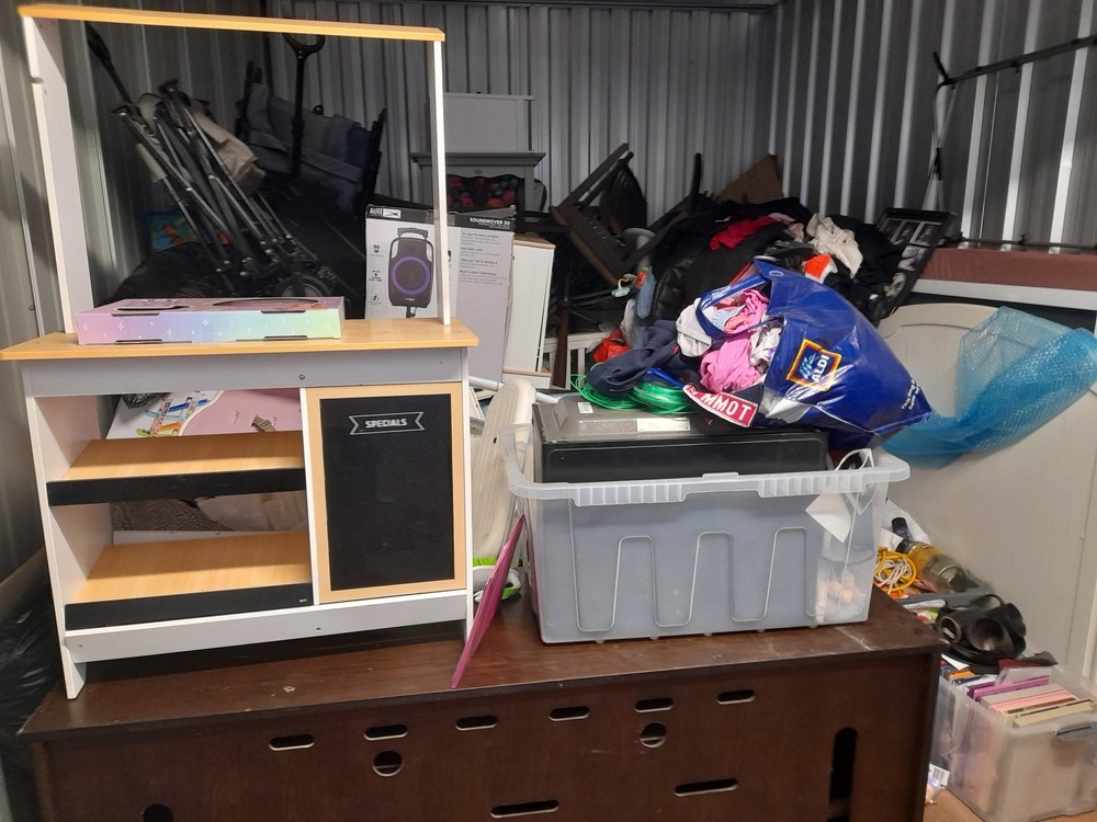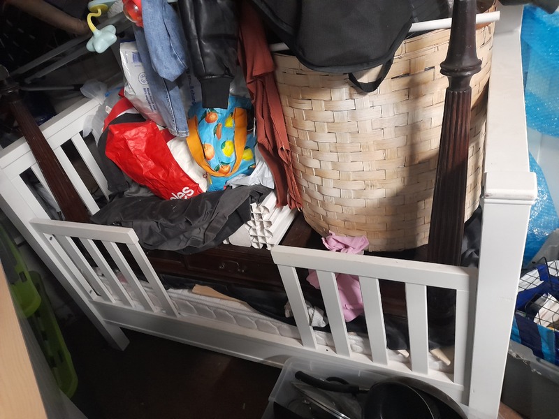 Furniture - double bed and mattress, dining table with 5 chairs, bookshelf, bedside table, tv unit, console table, cot, highchair, rugs x2, assorted kitchen items. Kids toys, books and clothes. Women's and men's clothes including a BOSS suit. Justin Bieber framed limited edition picture. Makita whipper snipper, tool chest, Sound rover party speaker, mirror and a speaker