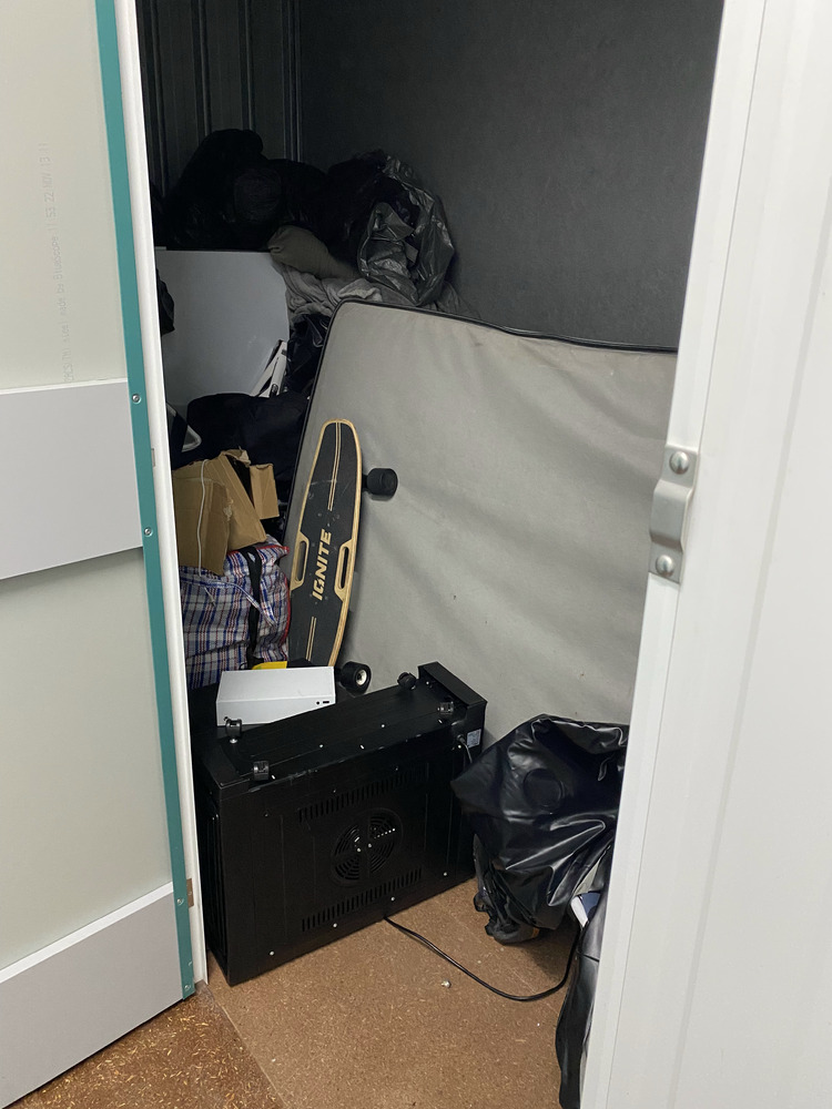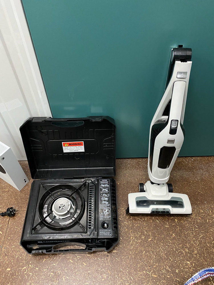 Fridge, Electric Skateboard, 2 Cabinets, Gas Burner, Xbox console, Assorted Clothing / Linen / Pillows, Mattress, Microwave, 2 Weights, 2 x Air Mattresses, Bag of Assorted Books / game, Vacuum, Heater, Helmet, Punching Ball, Monitor, Neck Fan unit, Lego Kit, Backpack, Dome Tent, Butane Bottles, Cords