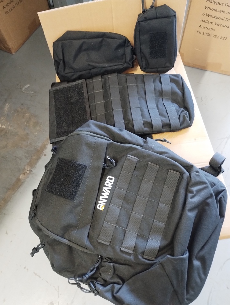 Baby carriers, back packs, and belt pouches in assorted colours