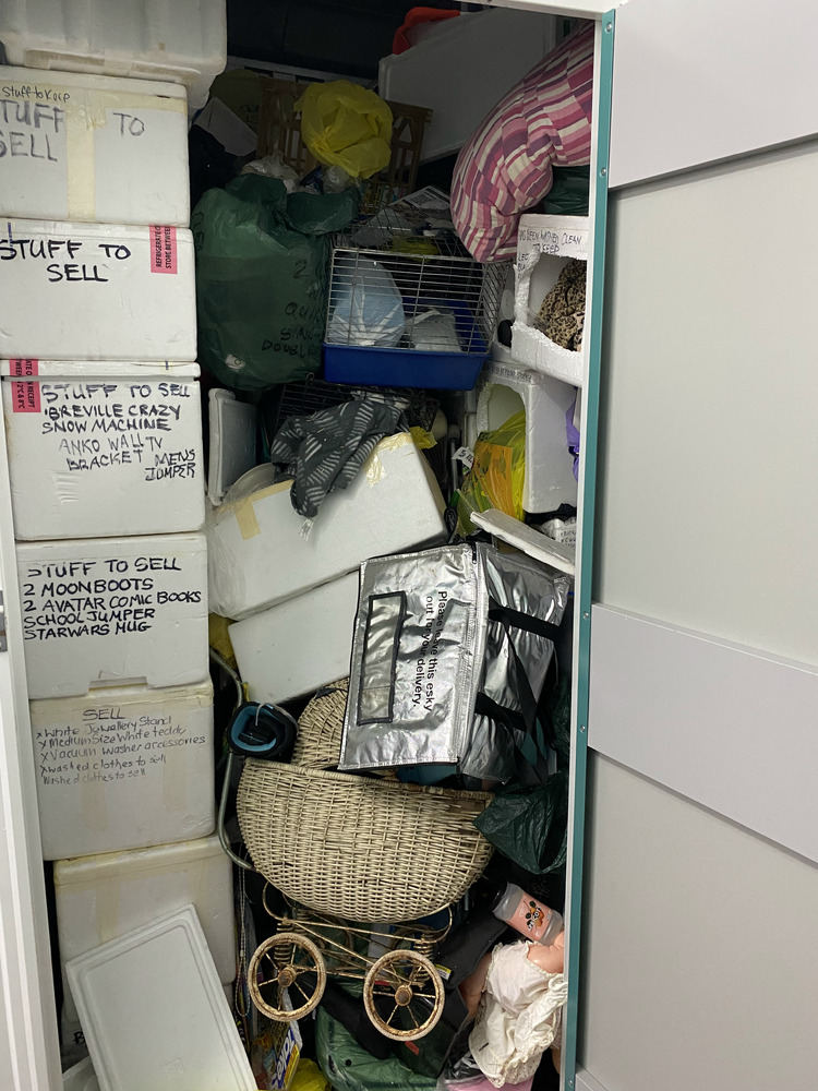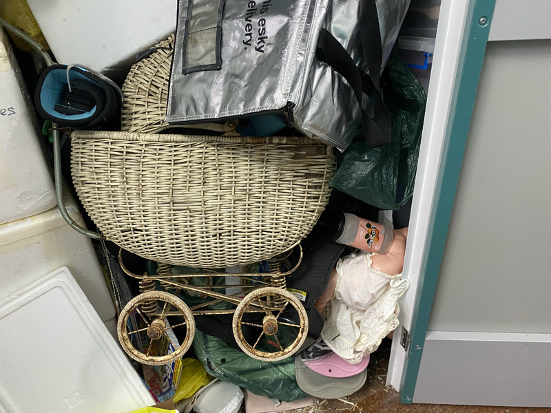Unit sold as seen – Old Style Pram / Doll, Boxes of Assorted household items, Cat Crates, Cooler Bag.