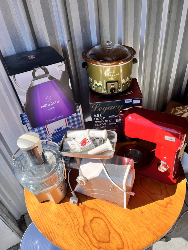 Breville juicer, Philips crock pot, George Foreman Mincer, Russel Hobbs Kettle, Kucher bench top mixer, loads of other cooking utensils