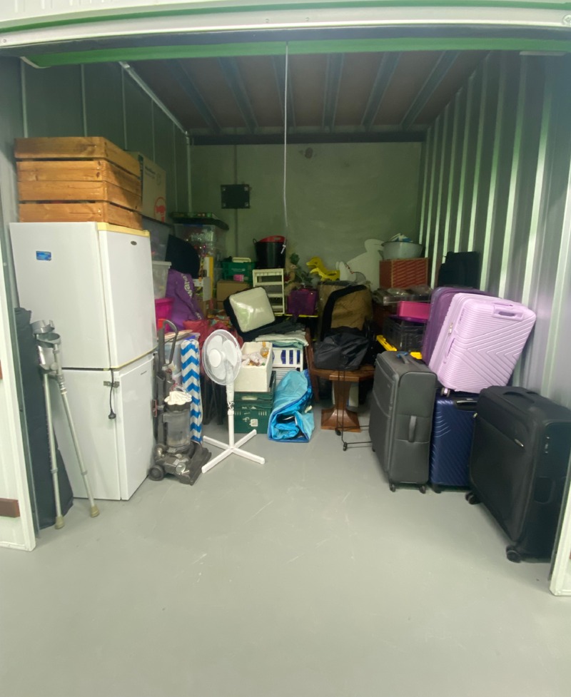 Boxes, containers, suitcases, crates, pedestal fan, white goods, dyson vacuum, drawers, table, wooden chest.