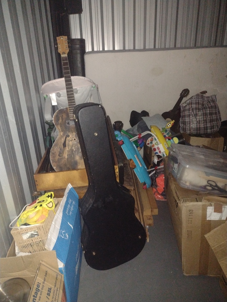 1 x child's pram, 1 x toy bear, 1 x baby basinet, 1 x toy "Bluey, 3 x boxes bric-a-brac, 1 x bag assorted clothes, 4 x plastic tubs of bric-a-brac, 1 x queen mattress, 1 x single mattress, 1 x bed frame, 1 x set wooden bed slats, 2 x wooden coffee tables, 1 x wooden computer desk, 1 x wooden cabinet + drawers, 1 x wooden table, 1 x lounge, 1 x box cushions, lounge cushions, 1 x box games, 1 x pair bongo drums, 1 x toy violin, 3 x guitars, 1 x guitar case, 1 x camp chair, 1 x metal wall sculpture, 1 x wooden bird sculpture, 1 x box rocks, 1 x wheel + tyre, 1 x microwave-LG 1200W, 1 x motorcycle helmet, 1 x roll plastic