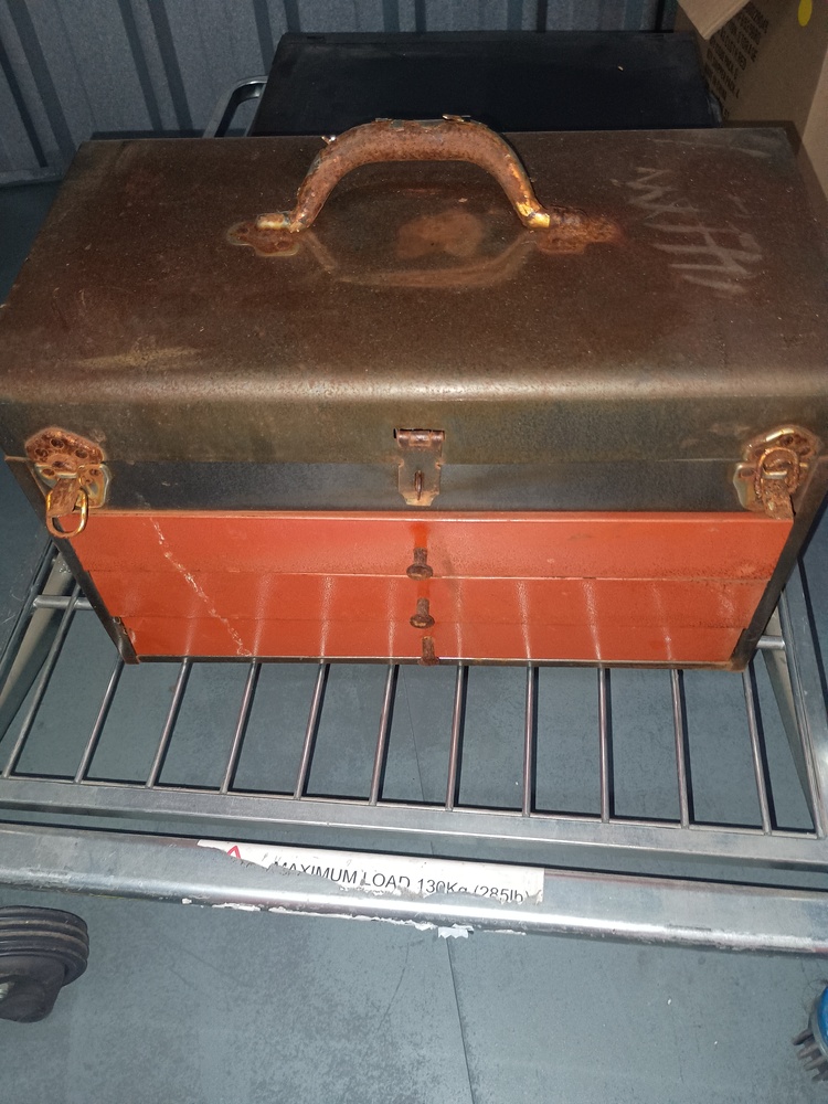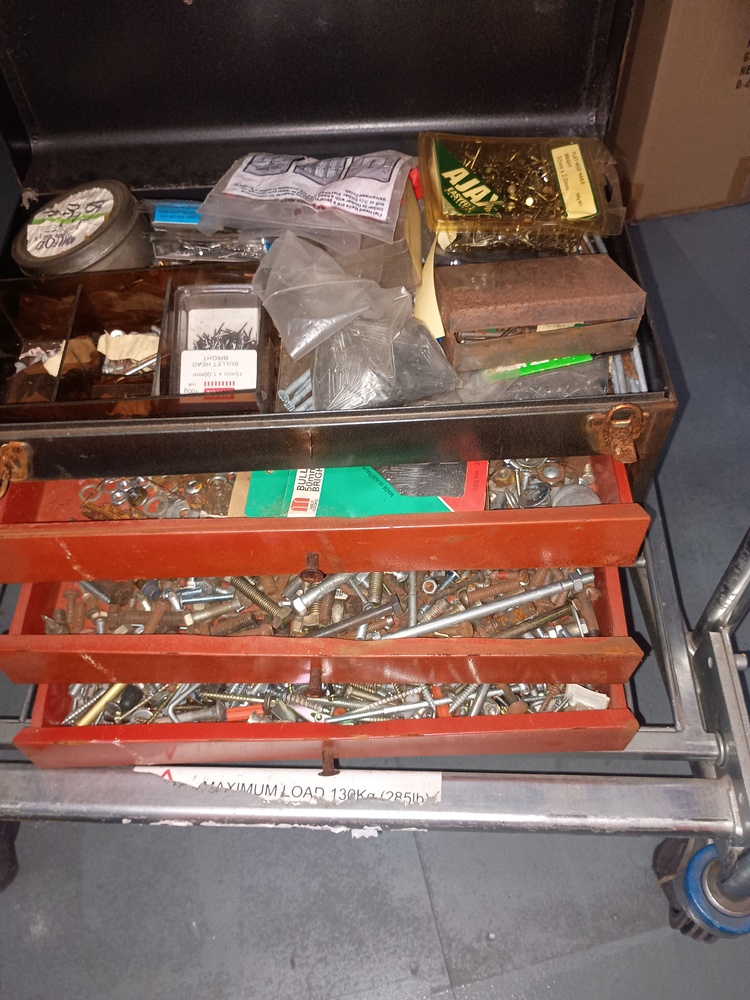 Tool box with hand tools and various screws and bolts
