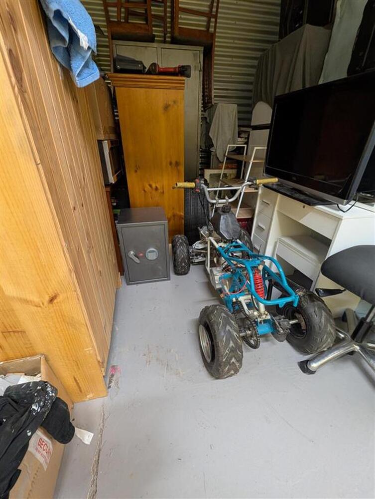 From what we can see inside this unit we have, Tools, Furniture, quadbike, Safe, Tyres, TV 's and lots of boxes full of stuff. We could not see all the way in.