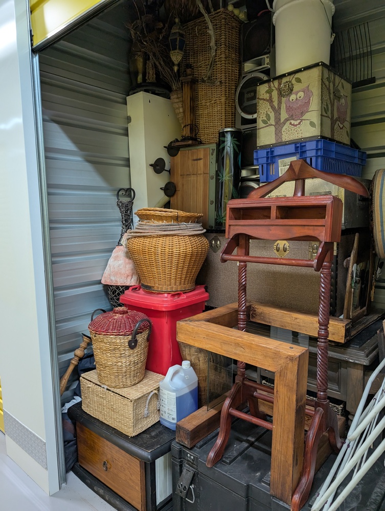 From what we can see inside this unit we have, Furniture, swag, baskets, wooden chests, speakers and lots of boxes/bags full of stuff. We could not see all the way in.